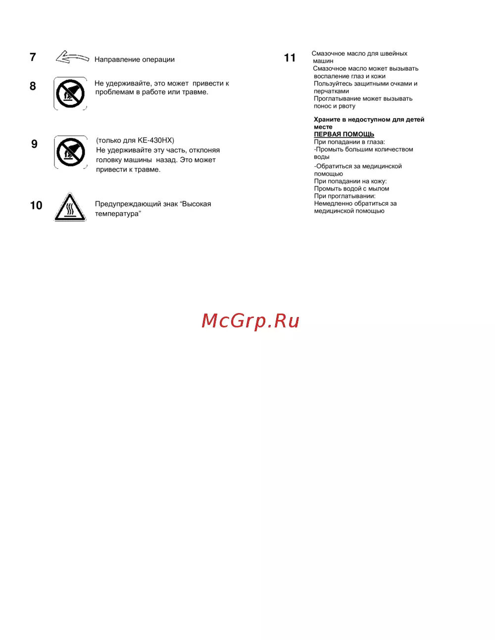 - Только для ke 430hx не удерживайте эту часть отклоняя головку машины назад это может привести к травме p.9