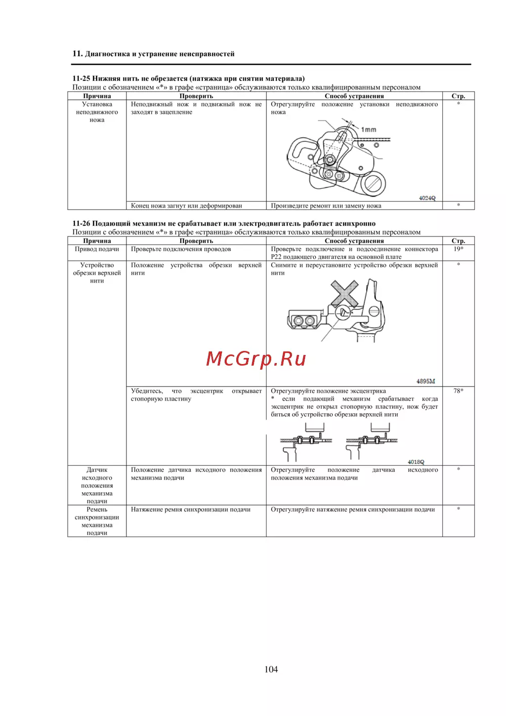 - 25 нижняя нить не обрезается натяжка при снятии материала 11 25 нижняя нить не обрезается натяжка при снятии материала позиции с обозначением в графе страница обслуживаются только квалифицированным персоналом p.104