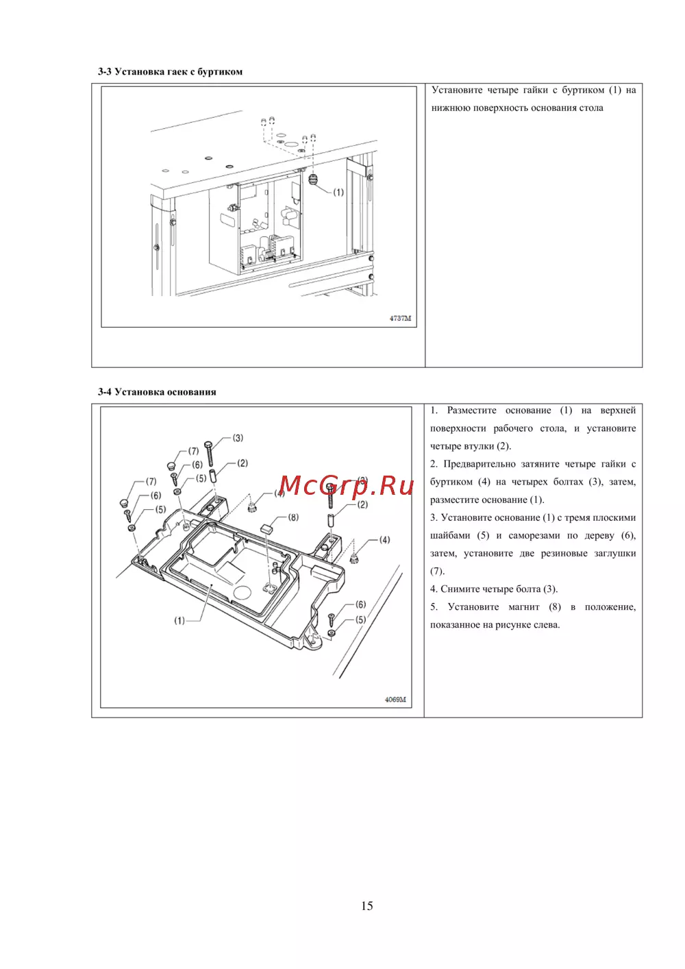 Brother HE-800B-02 — инструкция по установке основания стола с гайками и втулками [15/106]