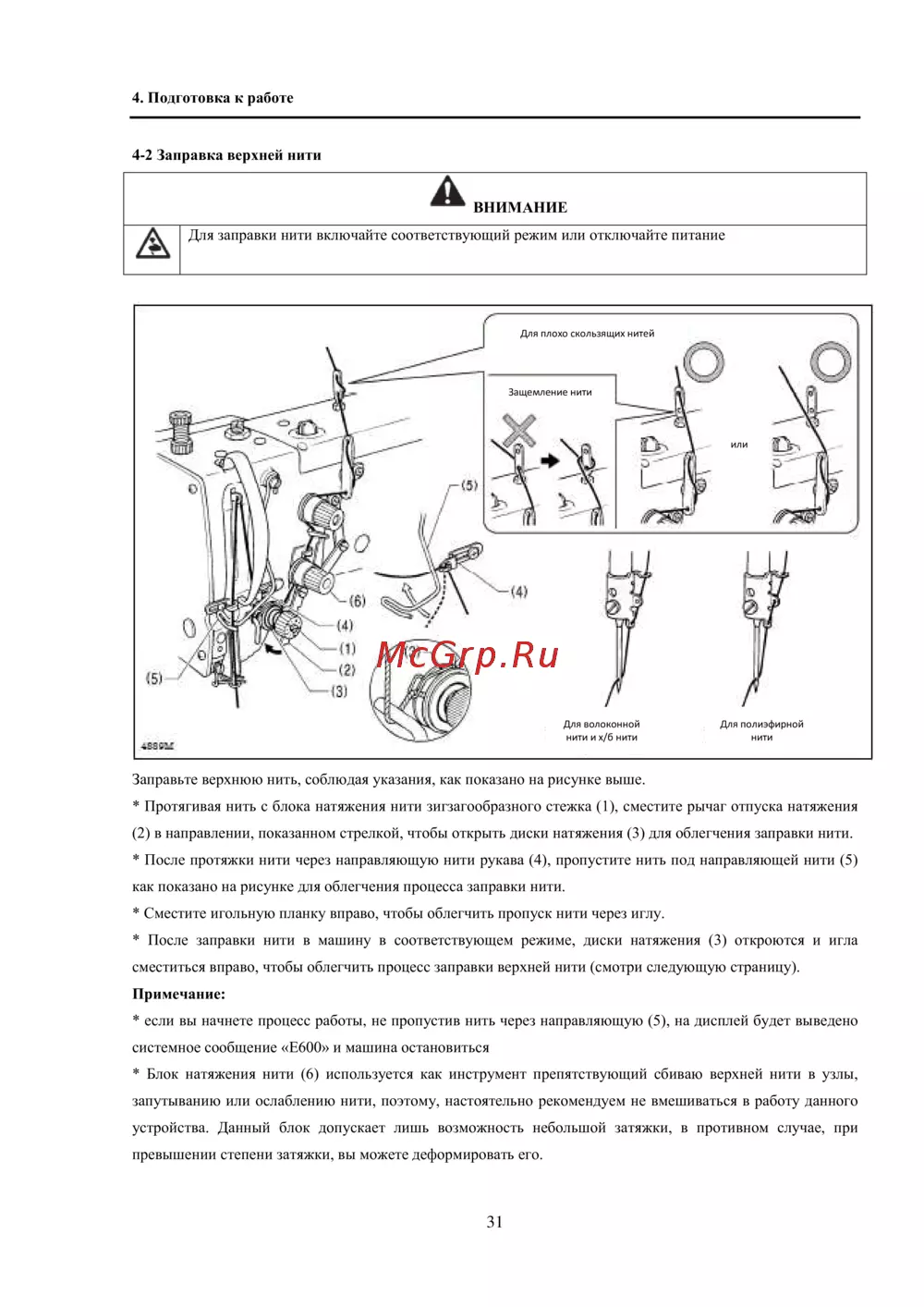 * Блок натяжения нити (6) используется как инструмент препятствующий сбиваю верхней нити в узлы,
