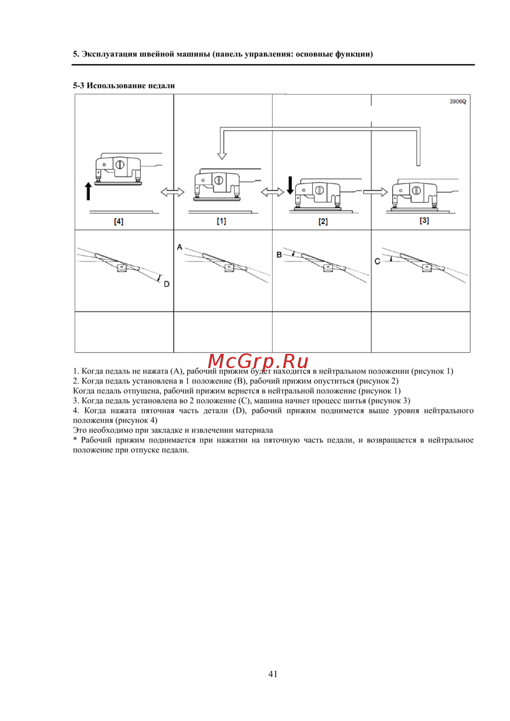 * Рабочий прижим поднимается при нажатии на пяточную часть педали, и возвращается в нейтральное