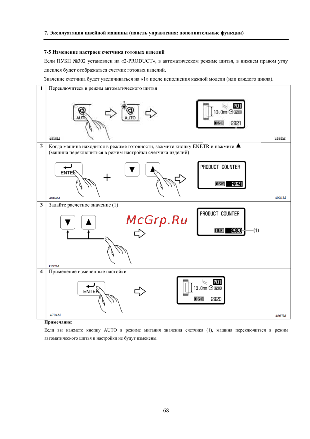 Если вы нажмете кнопку AUTO в режиме мигания значения счетчика (1), машина переключиться в режим