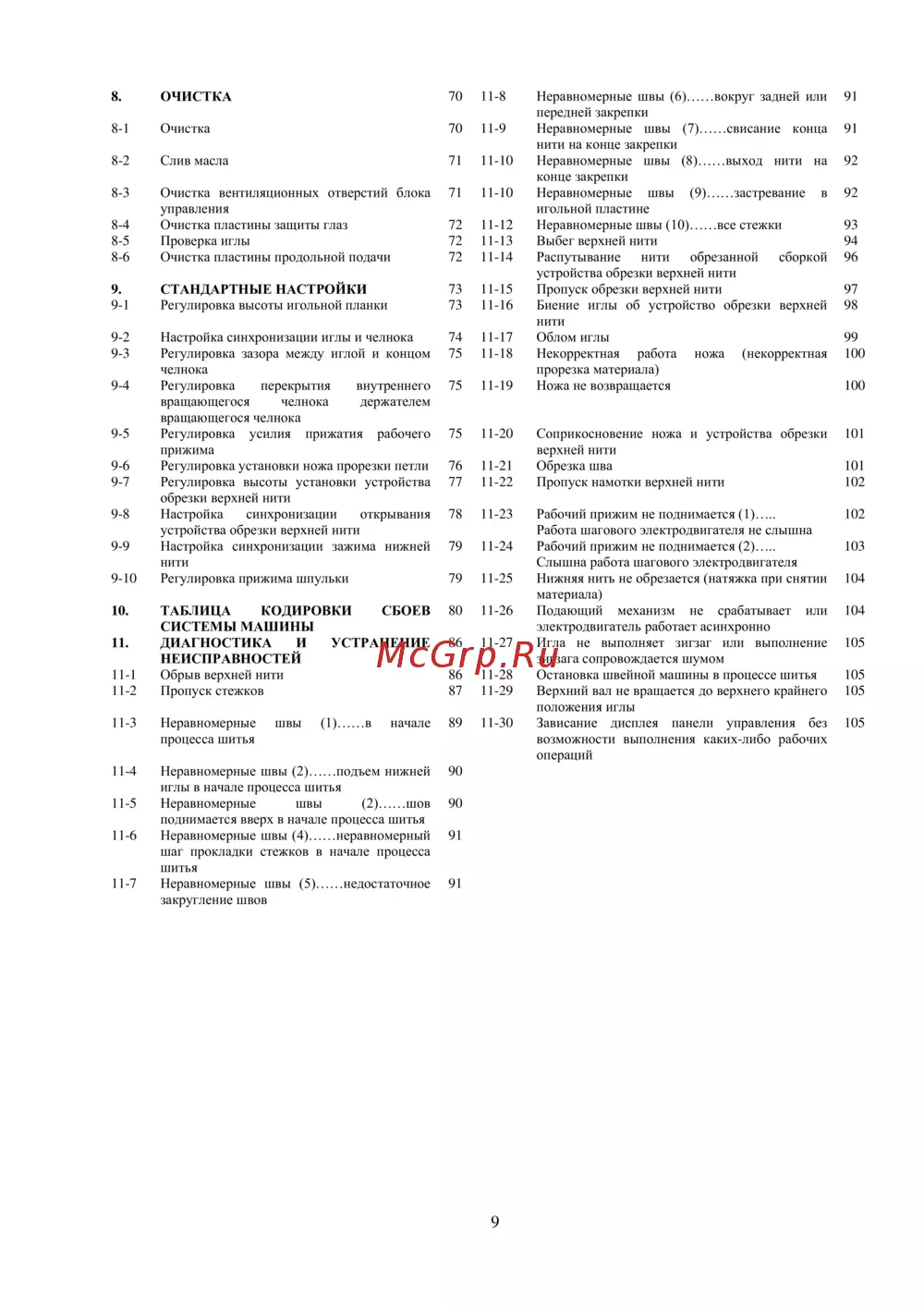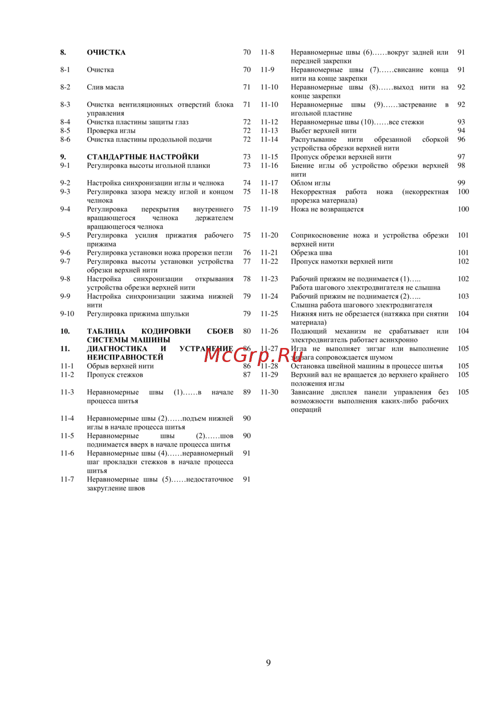 - 11 неравномерные швы 9 застревание в игольной пластине участки передней и задней закрепки материала застревают в игольном отверстии позиции с обозначением в графе страница обслуживаются только квалифицированным персоналом p.92