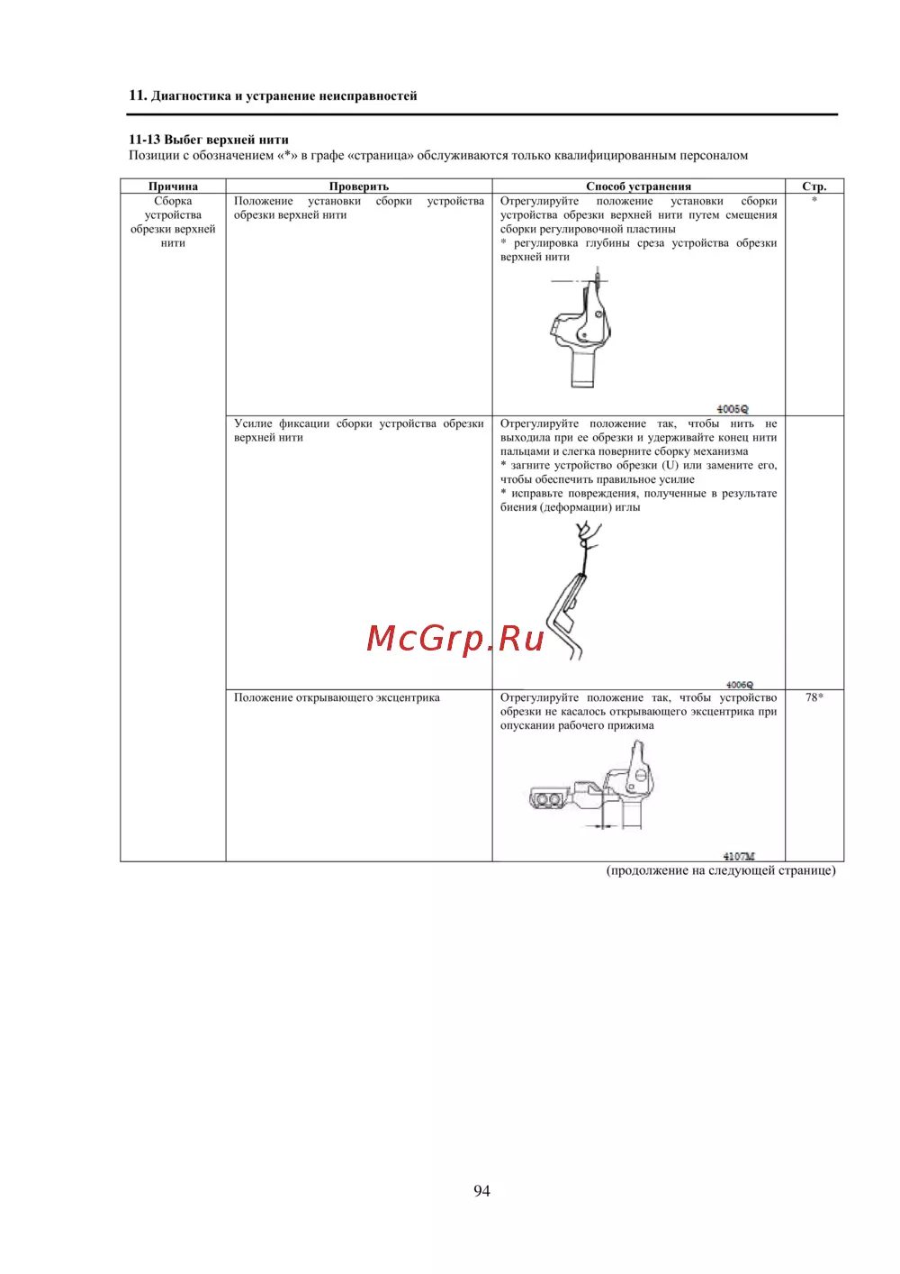 - 14 распутывание нити обрезанной сборкой устройства обрезки верхней нити 11 14 распутывание нити обрезанной сборкой устройства обрезки верхней нити позиции с обозначением в графе страница обслуживаются только квалифицированным персоналом p.96