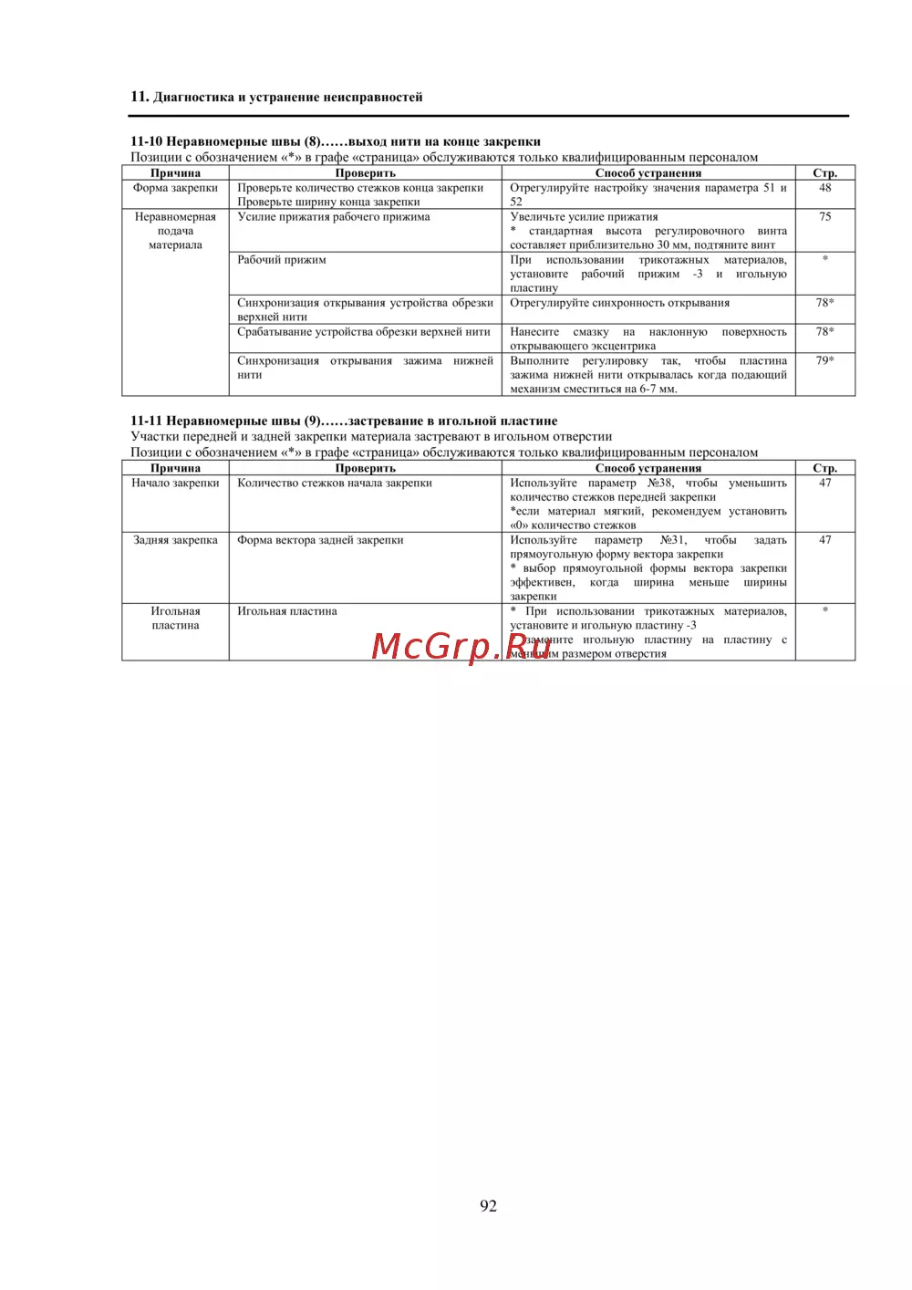 - 11 неравномерные швы 9 застревание в игольной пластине участки передней и задней закрепки материала застревают в игольном отверстии позиции с обозначением в графе страница обслуживаются только квалифицированным персоналом p.92