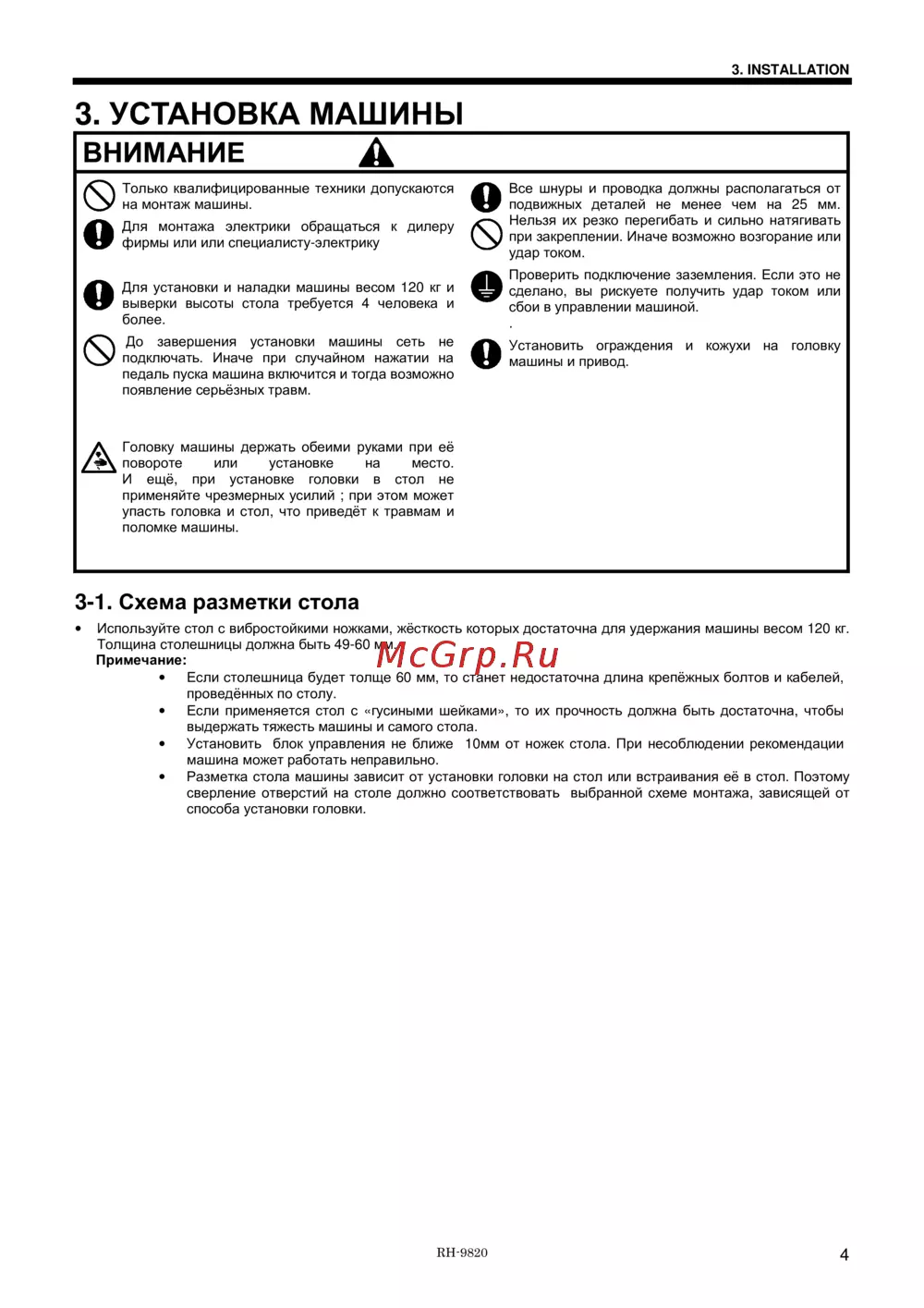 Brother RH-9820-01/02 — установка машины: безопасные рекомендации и инструкции [15/139]