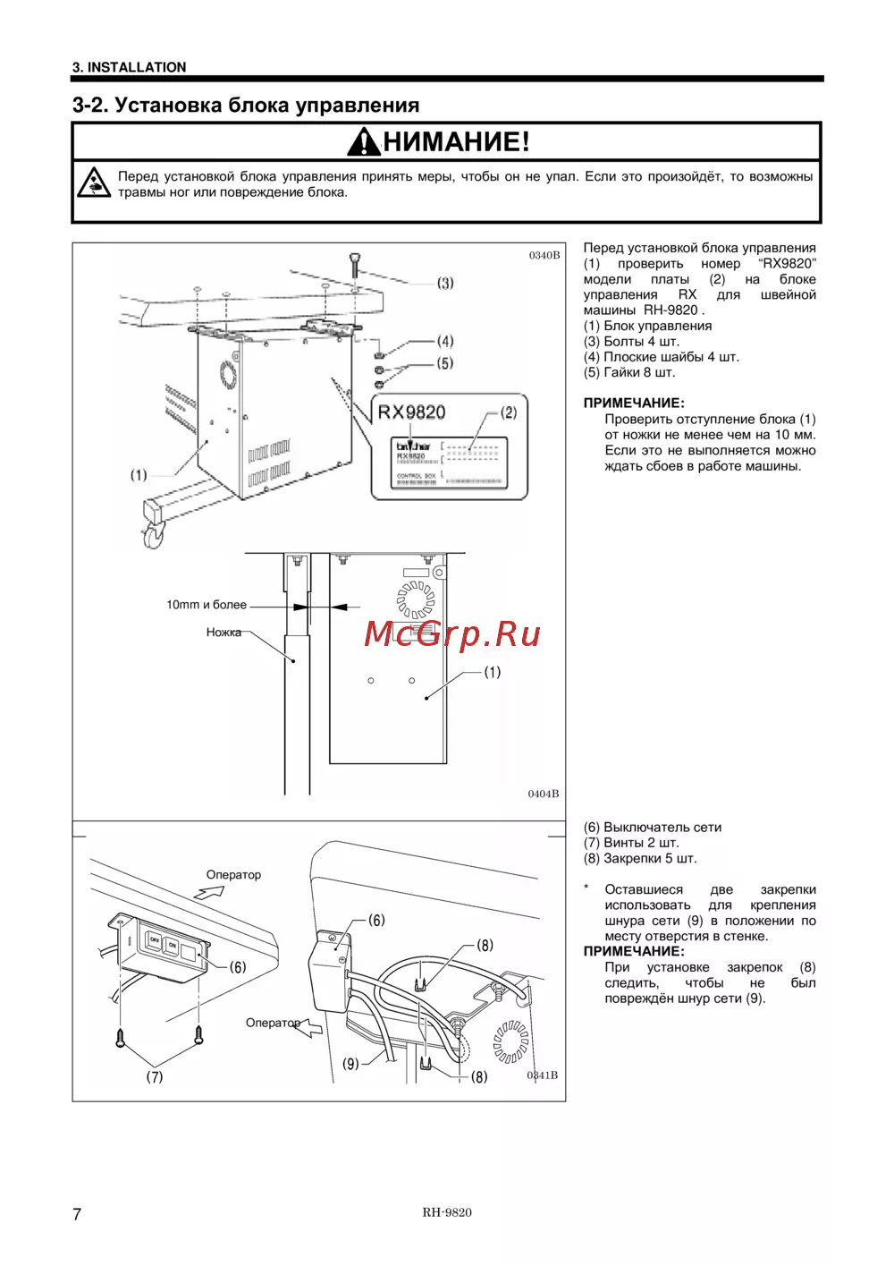 Подробное руководство по установке блока управления для швейной машины. Узнайте, как избежать травм и повреждений при установке. Следуйте инструкциям для безопасной установки.