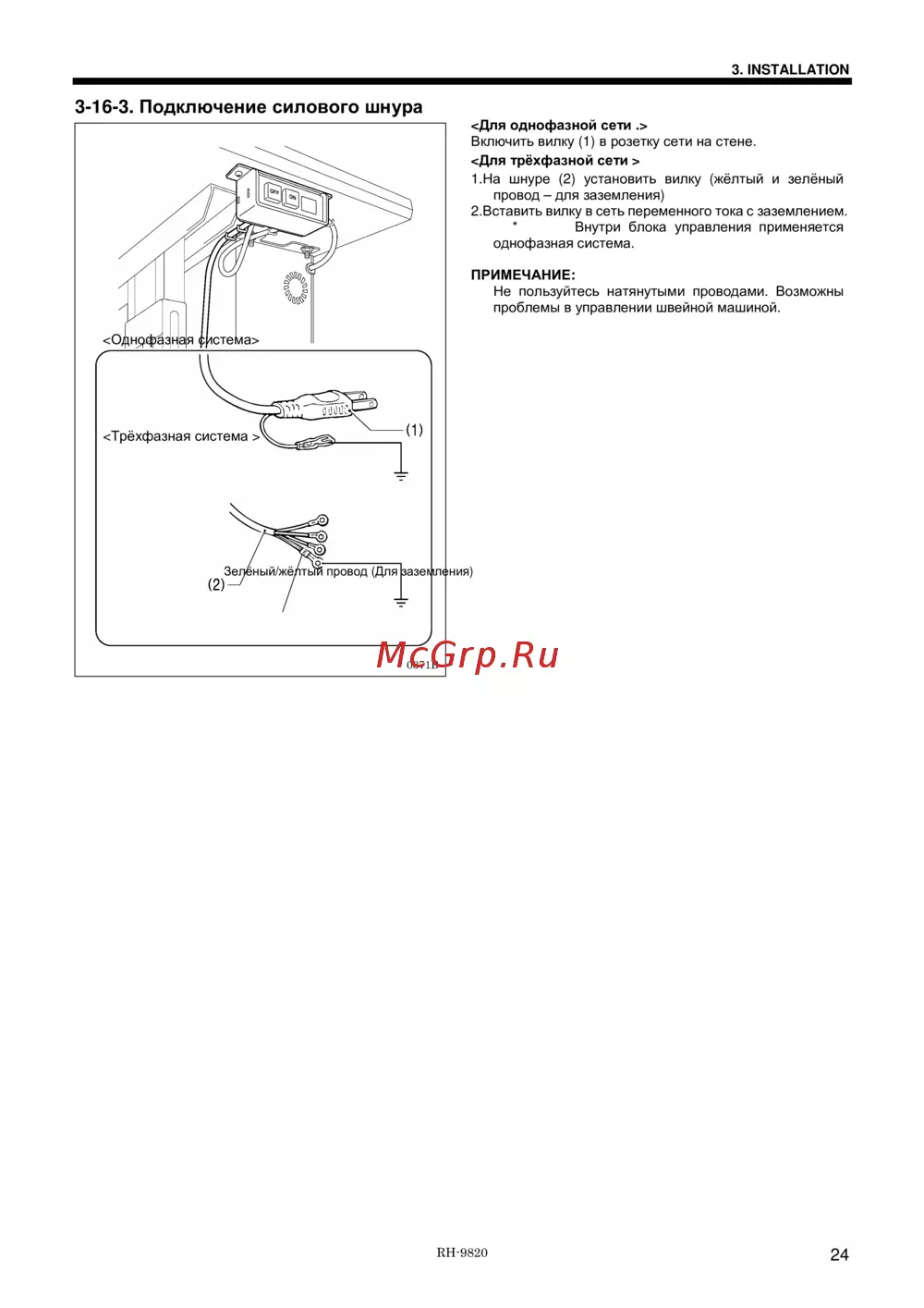 Brother RH-9820-01/02 — установка и подключение швейной машины к электросети [35/139]