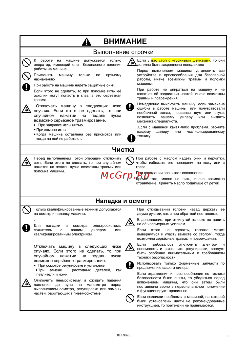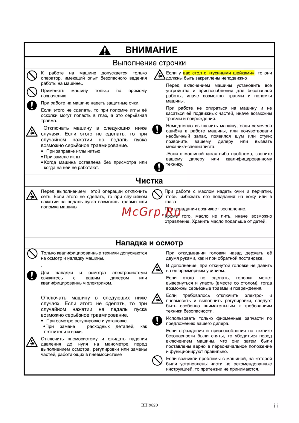 Brother RH-9820-01/02 — безопасная работа с машиной: инструкции и рекомендации [5/139]