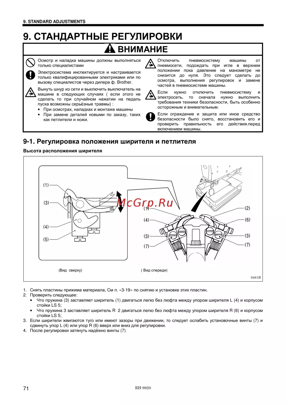 Brother RH-9820-01/02 — стандартные регулировки и безопасность при обслуживании машин [94/139]