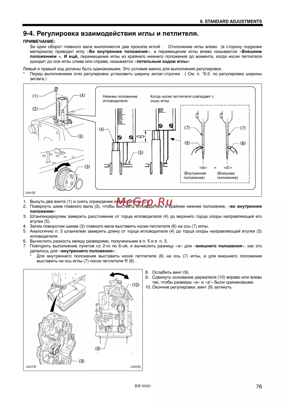 9-4. Регулировка взаимодействия иглы и петлителя.