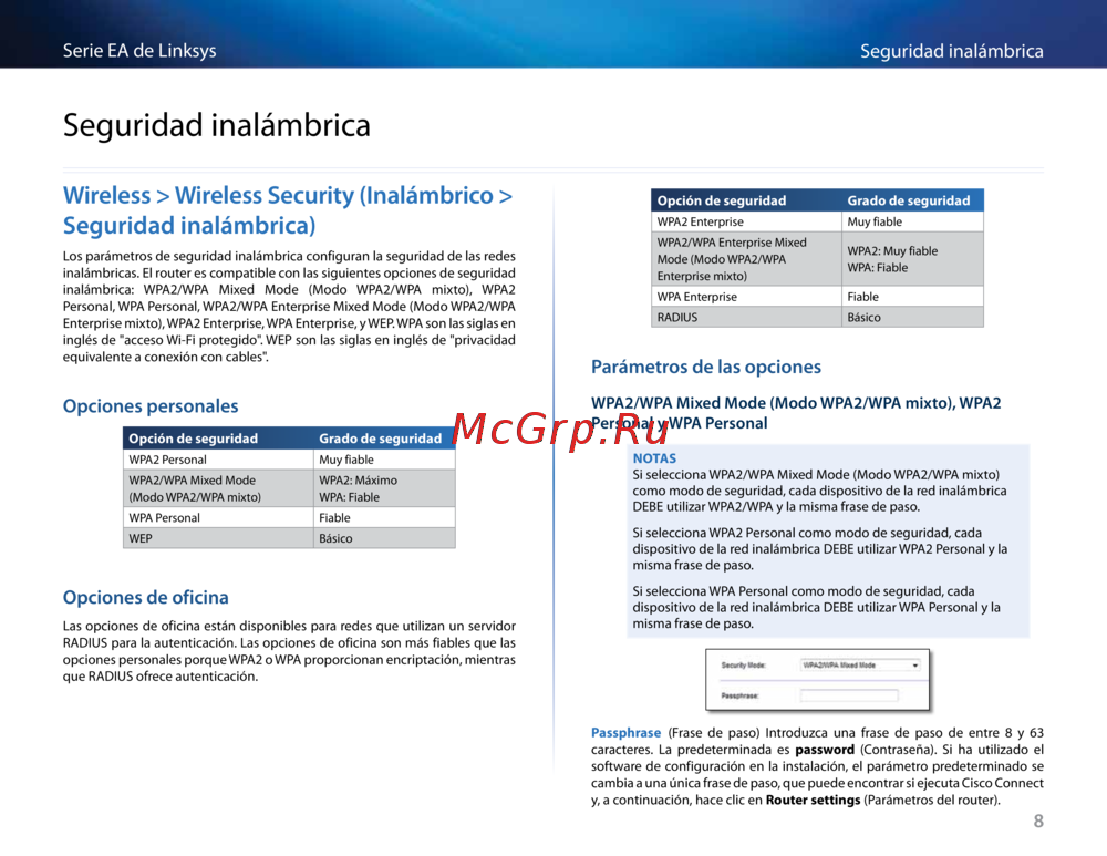 inalámbrica: WPA2/WPA Mixed Mode (Modo WPA2/WPA mixto), WPA2