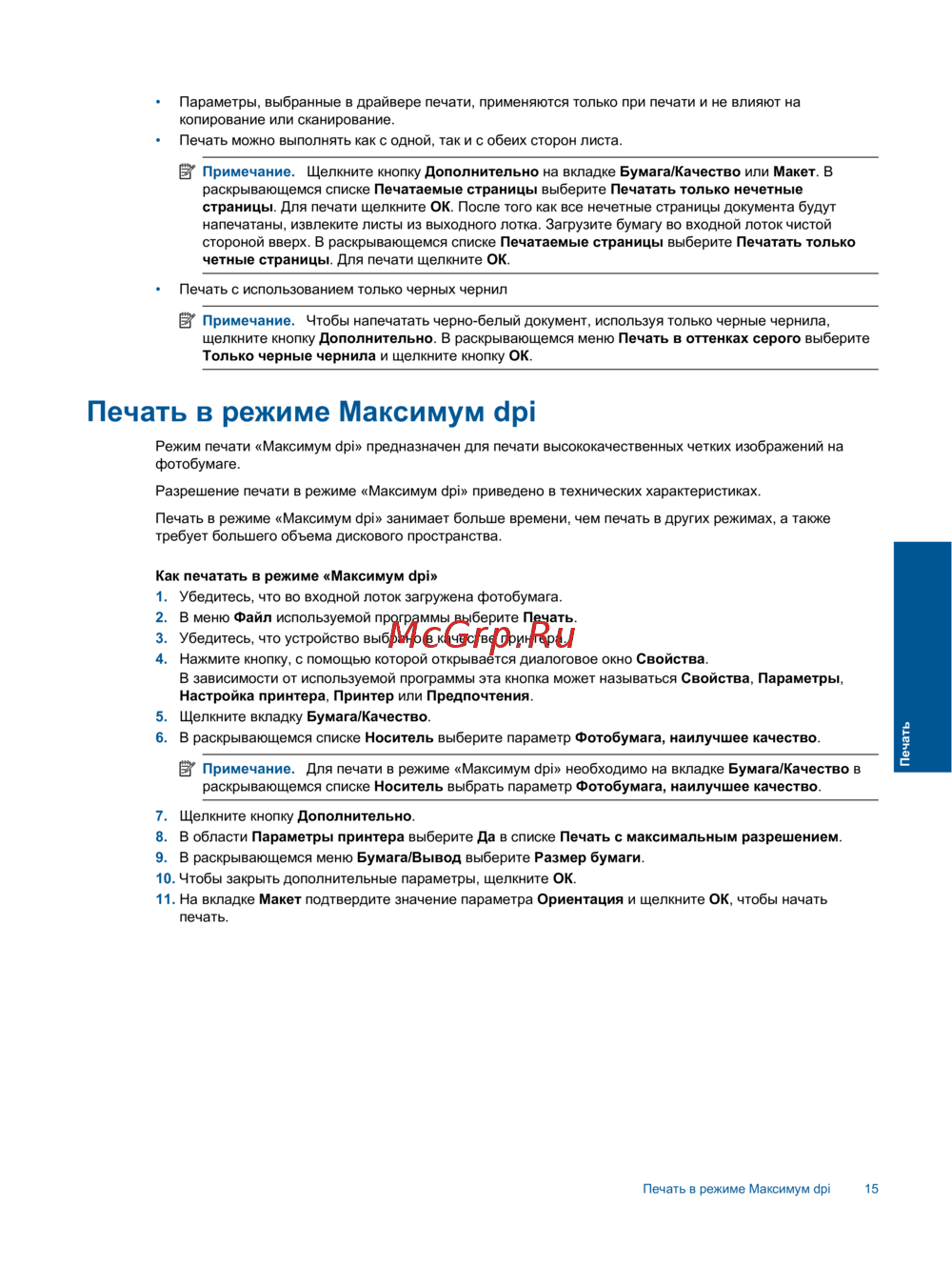 Печать в режиме «Максимум dpi» занимает больше времени, чем печать в других режимах, а также
