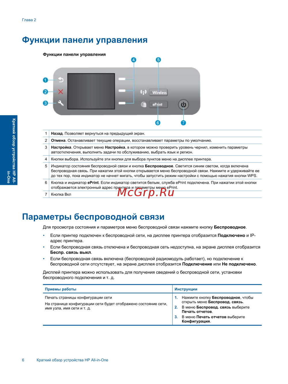 ![HP 3070A В611B [8/62] Для просмотра состояния и параметров меню беспроводной связи нажмите кнопку беспроводное](/views2/1499884/page8/bg8.png)