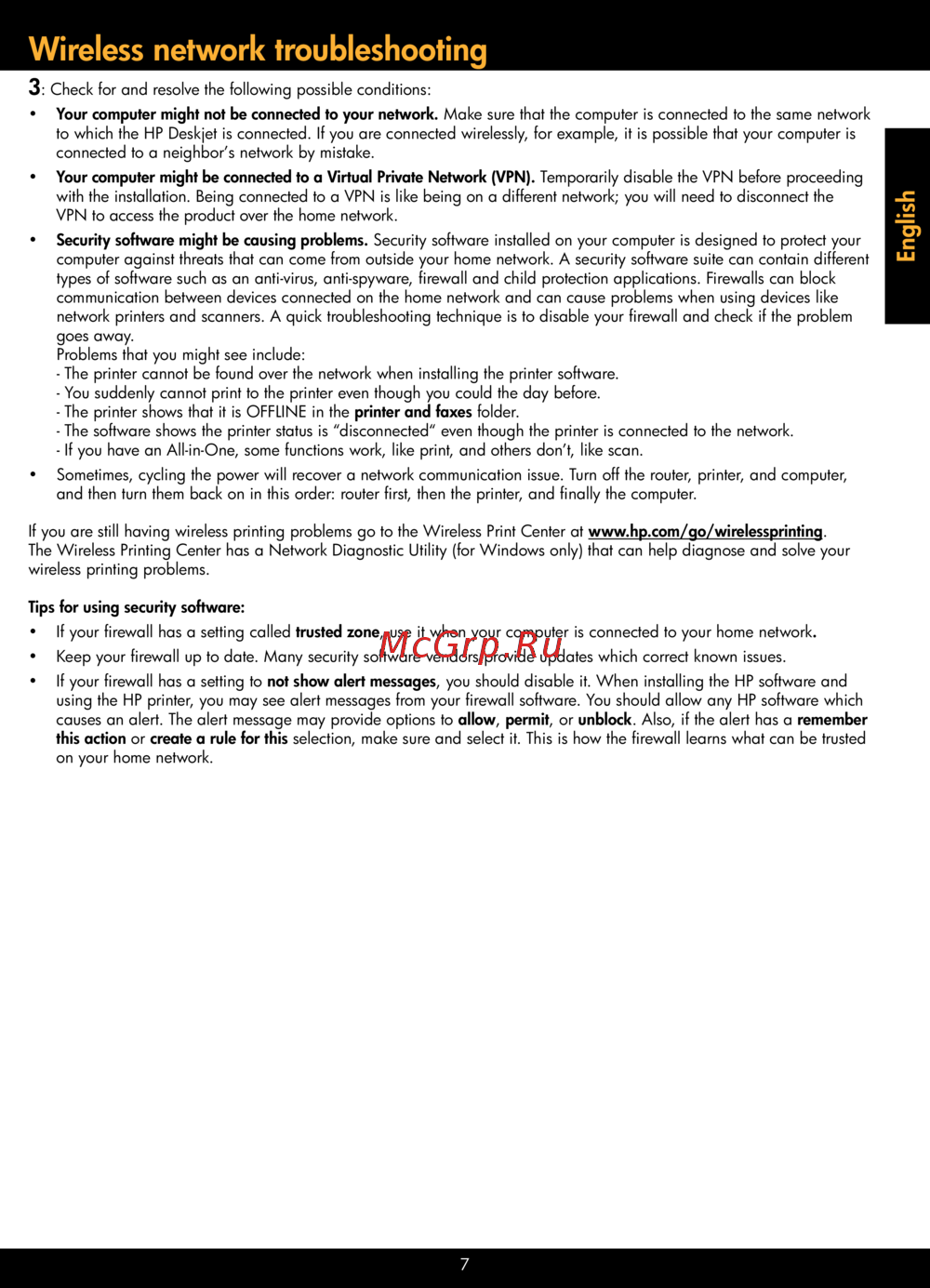 If you are still having wireless printing problems go to the Wireless Print Center at www.hp.com/go/wirelessprinting.