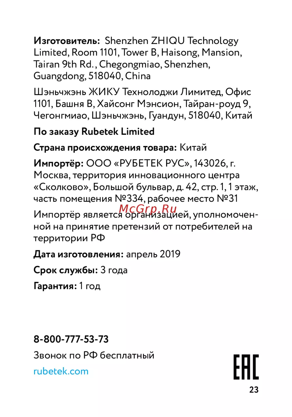 Импортёр: ООО «РУБЕТЕК РУС», 143026, г.