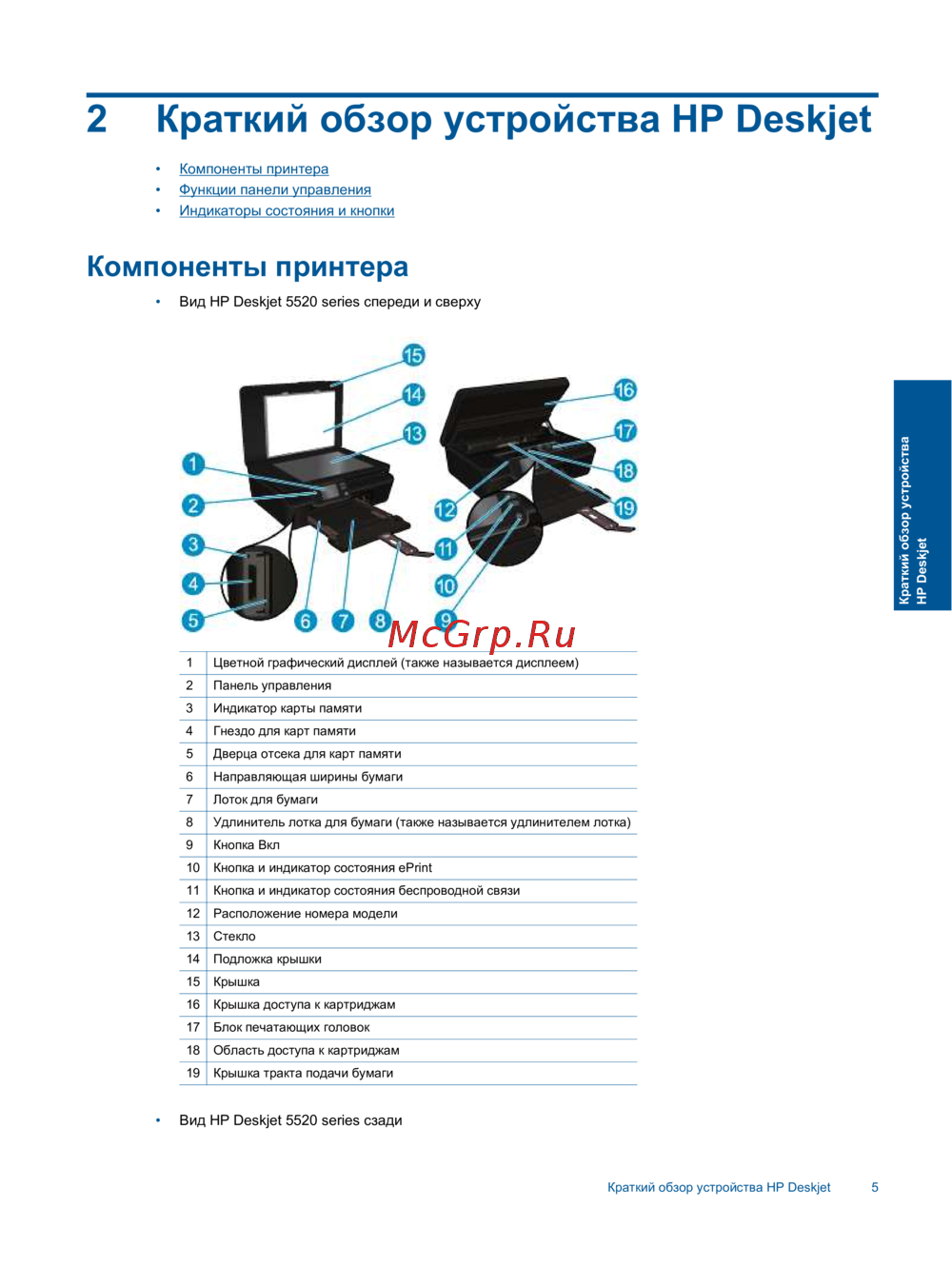 - Вид hp deskjet 5520 series спереди и сверху p.7