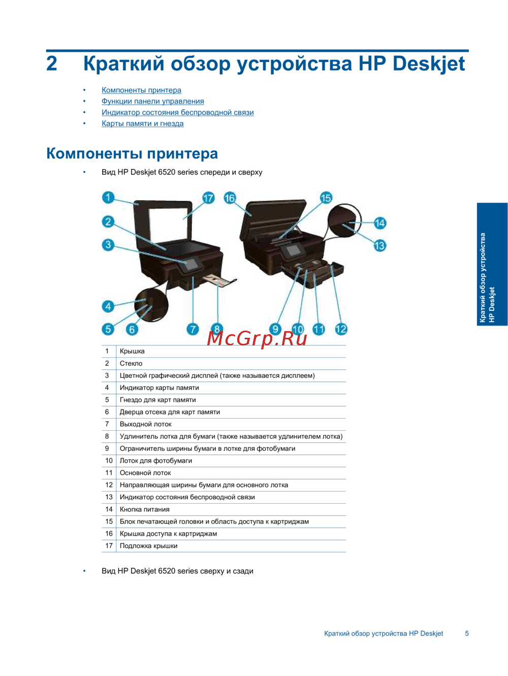 - Вид hp deskjet 6520 series сверху и сзади p.7