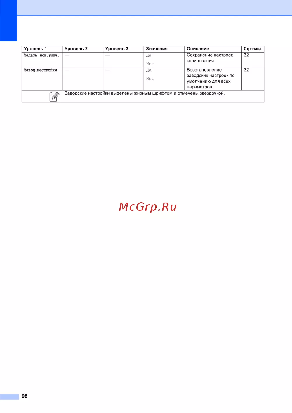 - Таблица поможет разобраться в имеющихся пунктах меню и значениях параметров устройства заводские настройки выделены жирным шрифтом и отмечены звездочкой p.100