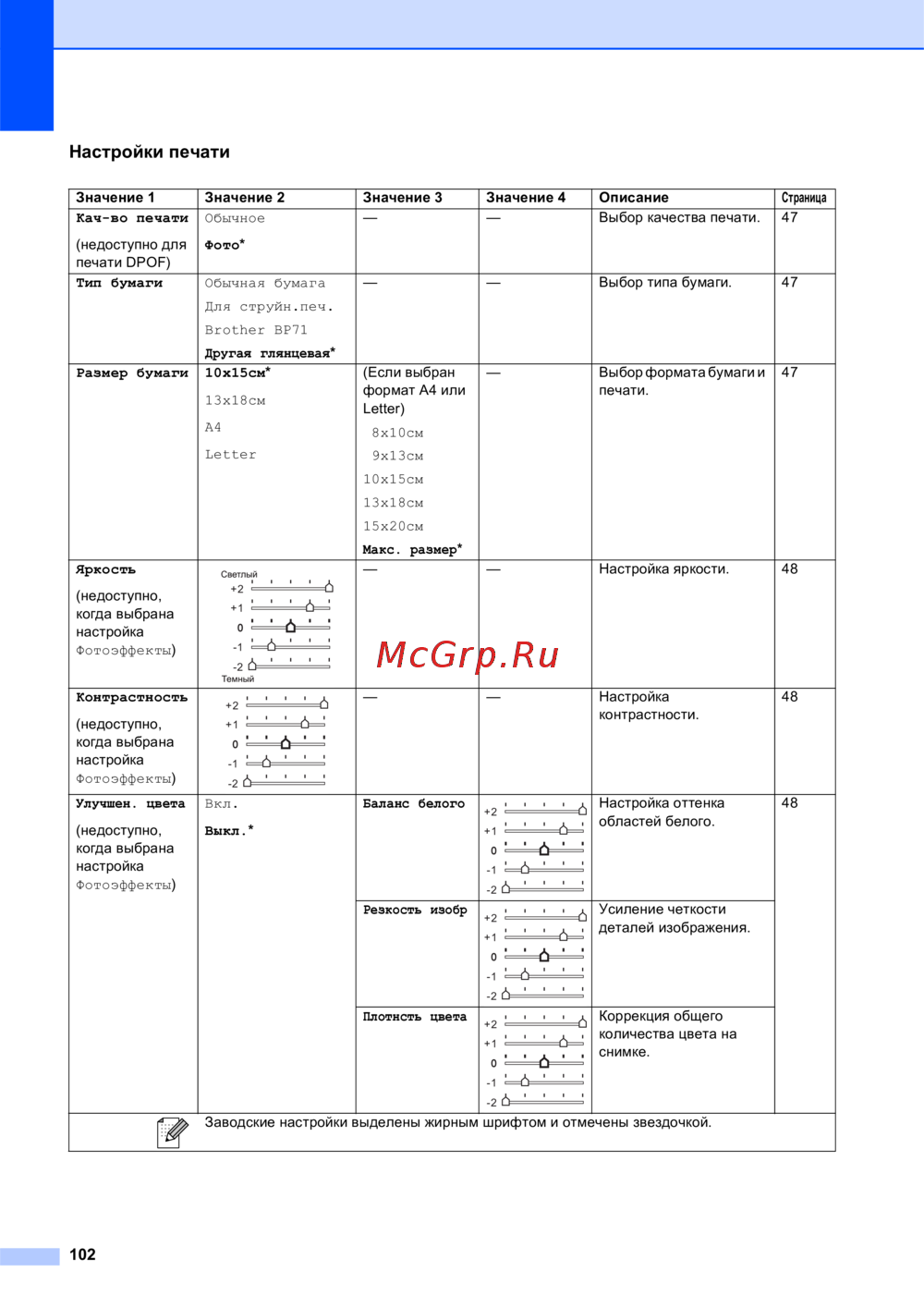 - Таблица поможет разобраться в имеющихся пунктах меню и значениях параметров устройства заводские настройки выделены жирным шрифтом и отмечены звездочкой p.100