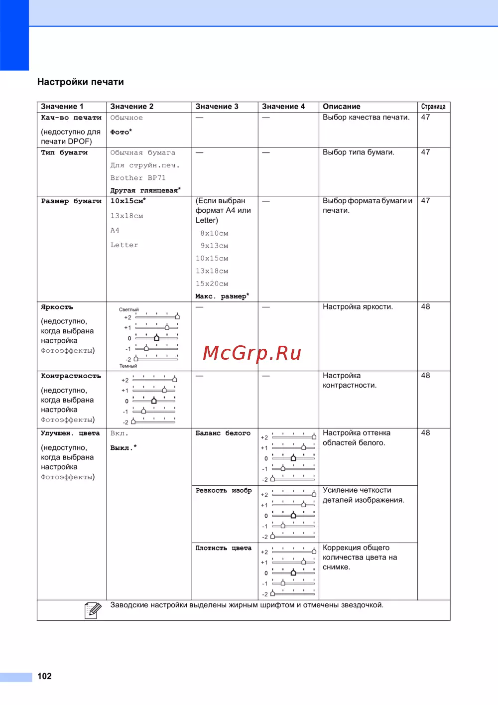 Заводские настройки выделены жирным шрифтом и отмечены звездочкой.