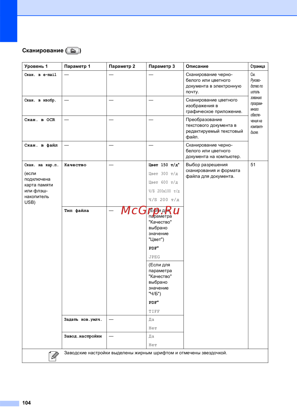 Заводские настройки выделены жирным шрифтом и отмечены звездочкой.