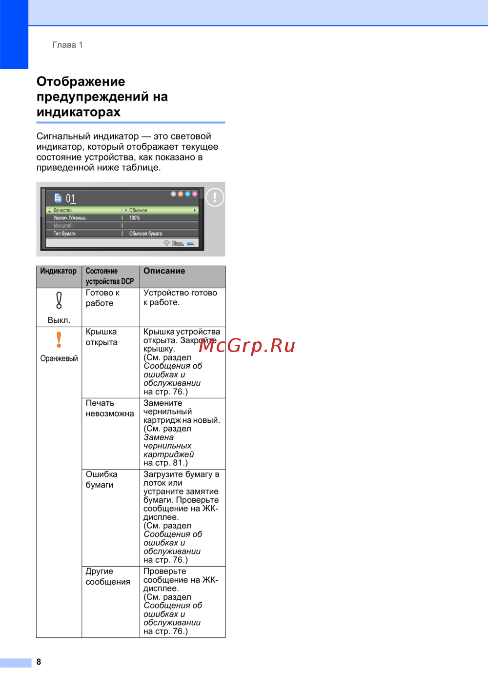 Brother DCP-385C — сигнальные индикаторы и их значения для устройств [16/131]