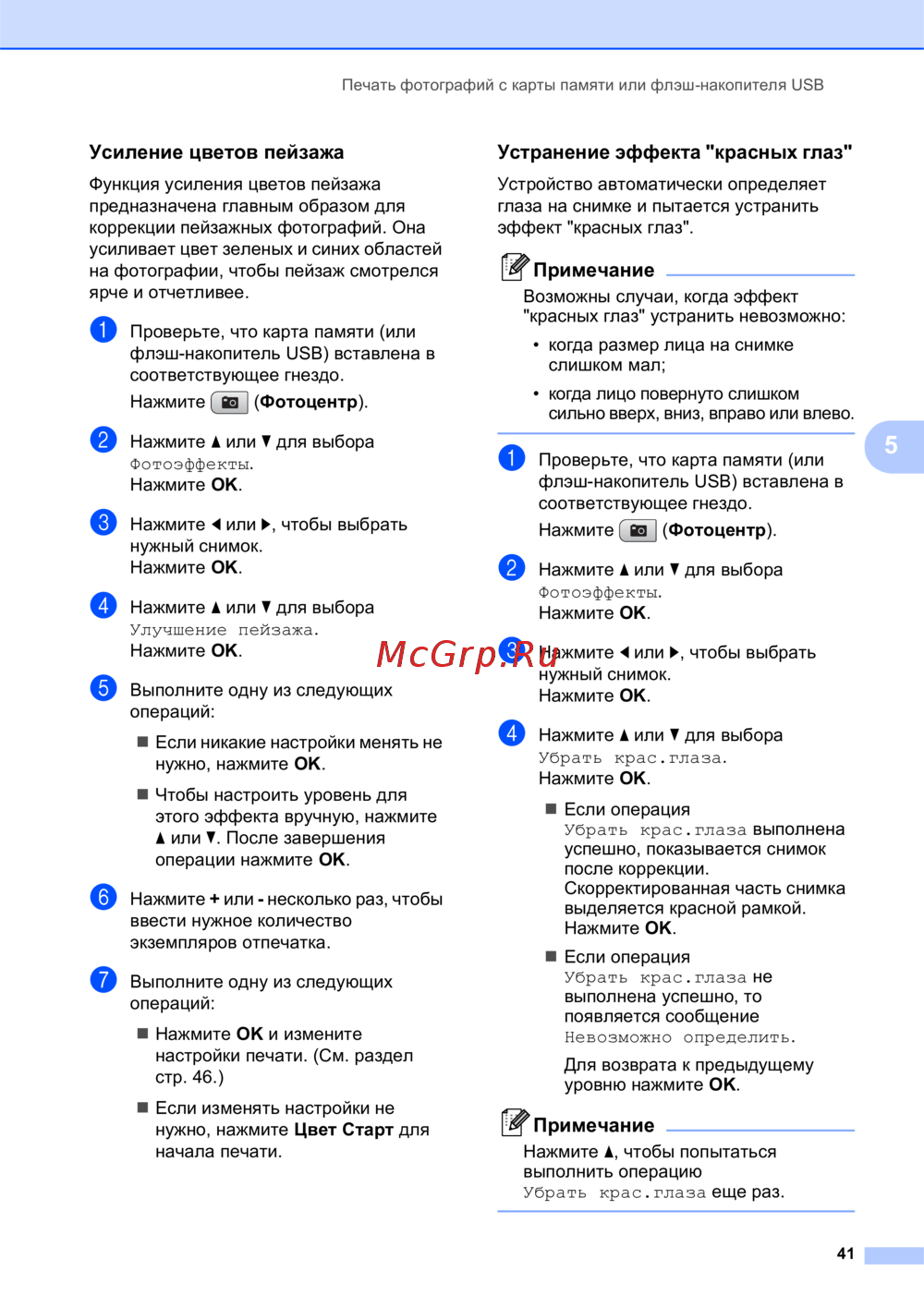 Узнайте, как печатать фотографии с карты памяти и улучшать их качество с помощью функций коррекции цвета и устранения эффекта 'красных глаз'.
