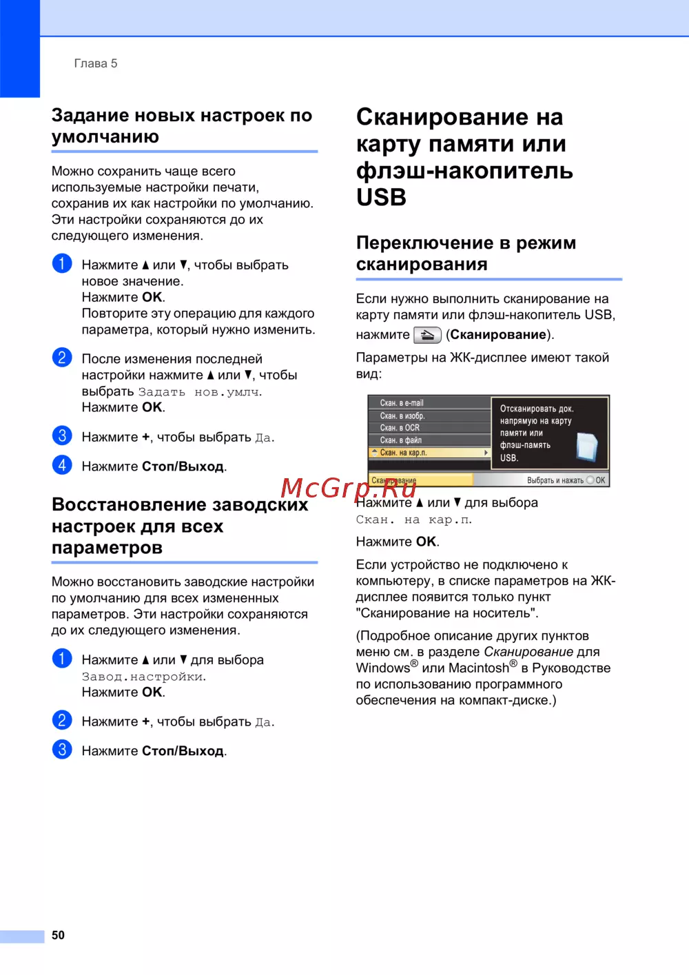 Узнайте, как сохранить настройки печати по умолчанию и восстановить заводские параметры. Пошаговые инструкции по сканированию на карту памяти или флэш-накопитель.