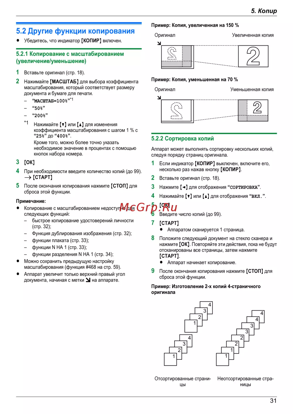 Panasonic KX-MB1500RUD — функции копирования: масштабирование и сортировка копий [31/84]