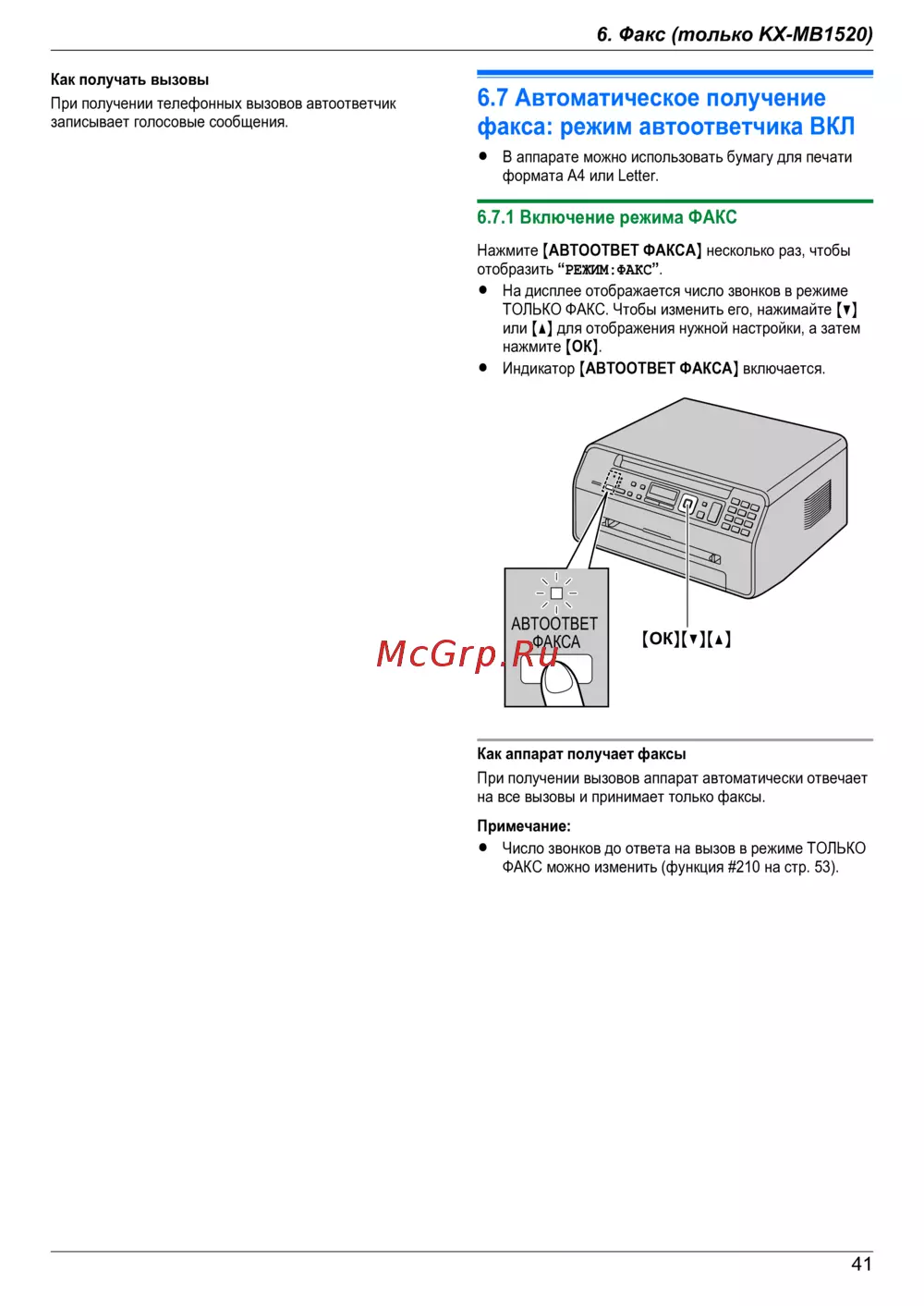 Panasonic KX-MB1500RUD — как настроить автоответчик для приема вызовов и факсов [41/84]
