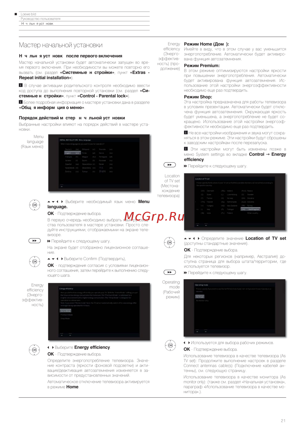 Узнайте, как выполнить начальную установку телевизора с помощью мастера установки. Следуйте простым шагам для настройки языка, энергопотребления и других параметров.