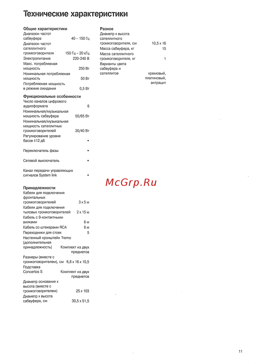 Технические характеристики Общие характеристики Разное Диапазон частот сабвуфера Диаметр х высота сателлитного громкоговорителя см 40 150 Гц Диапазон частот сателлитного громкоговорителя 150 Гц 20 кГц Электропитание 220 240 В Макс потребляемая мощность 250 Вт Номинальная потребляемая мощность 50 Вт Потребляемая мощность в режиме ожидания 10 5x16 Масса сабвуфера кг 15 Масса сателлитного громкоговорителя кг 1 Варианты цвета сабвуфера и сателлитов кремовый платиновый антрацит 0 5 Вт Функциональные особенности Число каналов цифрового аудиоформата 6 Номинальная музыкальная мощность сабвуфера 50 65 Вт Номинальная музыкальная мощность сателлитных громкоговорителей 30 40 Вт Регулирование уровня басов 12 дБ Переключатель фазы Сетевой выключатель Канал передачи управляющих сигналов System ink Принадлежности Кабели для подключения фронтальных громкоговорителей 3х5м Кабели для подключения тыловых громкоговорителей 2x15м Кабель с 9 контактными вилками 6м Кабель со штекерами RCA 6м Переходники для стоек 5 Настенный кронштейн Tremo дополнительная принадлежность Комплект из двух предметов Размеры вместе с громкоговорителем см 6 8х 16х 10 5 Подставка Concertos S Диаметр основания х высота вместе с громкоговорителем Диаметр х высота сабвуфера см Комплект из двух предметов 25 х 103 30 5 х 51 5 11