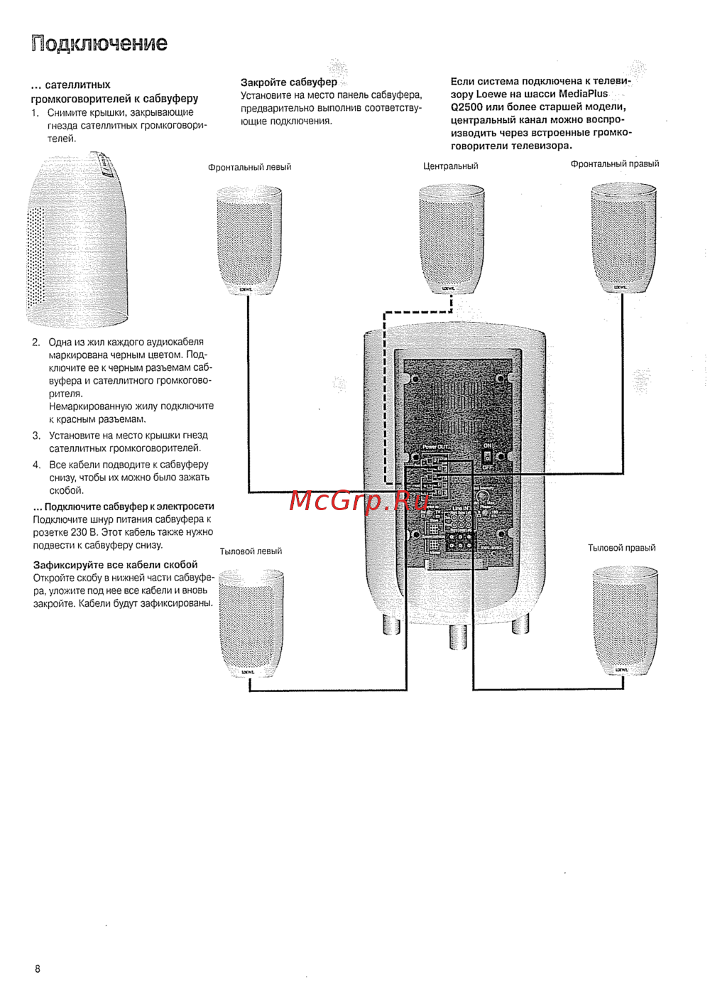 Подключение Закройте сабвуфер сателлитных громкоговорителей к сабвуферу Установите на место панель сабвуфера предварительно выполнив соответству ющие подключения 1 Снимите крышки закрывающие гнезда сателлитных громкоговори телей Фронтальный левый 2 Одна из жил каждого аудиокабеля маркирована черным цветом Под ключите ее к черным разъемам саб вуфера и сателлитного громкогово рителя Немаркированную жилу подключите к красным разъемам 3 Установите на место крышки гнезд сателлитных громкоговорителей 4 Все кабели подводите к сабвуферу снизу чтобы их можно было зажать скобой Подключите сабвуфер к электросети Подключите шнур питания сабвуфера к розетке 230 В Этот кабель также нужно подвести к сабвуферу снизу Зафиксируйте все кабели скобой Откройте скобу в нижней части сабвуфе ра уложите под нее все кабели и вновь закройте Кабели будут зафиксированы 8 Если система подключена к телеви зору Loewe на шасси MediaPius Q2500 или более старшей модели центральный канал можно воспро изводить через встроенные громко говорители телевизора Центральный Фронтальный правый