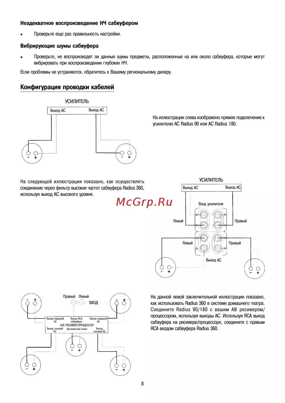 - Radius 180 это многоцелевые ас которые могут использоваться в различных конфигурациях систем они защищены от излучения магнитных волн и могут быть расположены даже в непосредственной близи от телевизора также radius 180 могут быть использованы как часть системы домашнего театра или многоканальной звуковой системы сабвуфер radius 360 может быть использован совместно с radius 180 для обеспечения глубокого и мощного звучания низких частот для справки пожалуйста прочтите раздел конфигурация проводки кабелей на стр 8 p.4