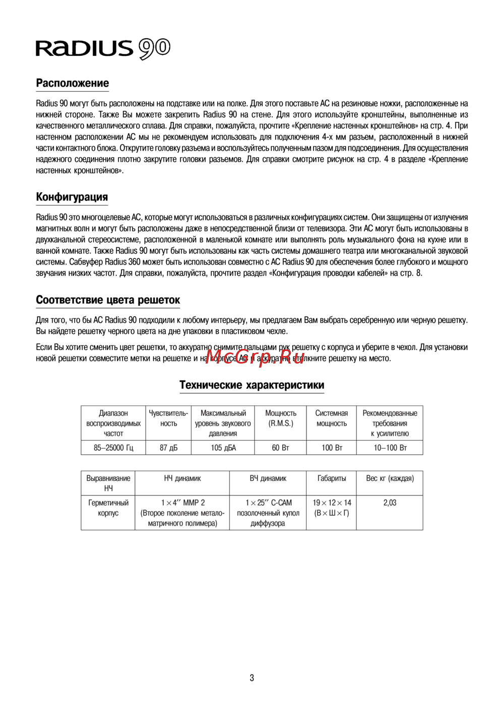- Radius 90 это многоцелевые ас которые могут использоваться в различных конфигурациях систем они защищены от излучения магнитных волн и могут быть расположены даже в непосредственной близи от телевизора эти ас могут быть использованы в двухканальной стереосистеме расположенной в маленькой комнате или выполнять роль музыкального фона на кухне или в ванной комнате также radius 90 могут быть использованы как часть системы домашнего театра или многоканальной звуковой системы сабвуфер radius 360 может быть использован совместно с ас radius 90 для обеспечения более глубокого и мощного звучания низких частот для справки пожалуйста прочтите раздел конфигурация проводки кабелей на стр 8 p.3
