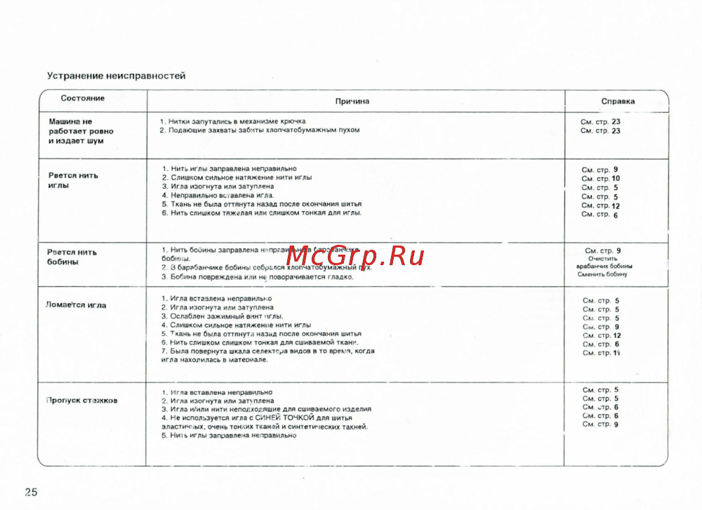 Устранение неисправностей Состояние Машина не работает ровно и издает шум Рвется нить иглы Рзется нить бобины Ломается игла Пропуск стежков ________________________ 25 Причина 1 Нитки запутались в механизме крючка 2 Подающие захваты забиты хлопчатобумажным пухом 1 Нить иглы заправлена неправильно 2 Слишком сильное натяжение нити иглы 3 Игла изогнута или затуплена 4 Неправильно вдавлена игла 5 Ткань не была оттянута назад после окончания шитья 6 Нить слишком тяжелая или слишком тонкая для иглы 1 Нить бооины заправлена неправильно в барабанчике бобины 2 3 барабанчике бобины собрался хлопчатобумажный пух 3 Бобина повреждена или не поворачивается гладко Справка См стр 23 См стр 23 См стр 9 См стр 10 См стр 5 См стр 5 См стр 12 См стр 6 См стр 9 Очистить арабанчик бобины Сменить бобину 1 Игла встазлена неправильно 2 Игла изогнута или затуплена 3 Ослаблен зажимный винт иглы 4 Слишком сильное натяжение нити иглы 5 ткань не была оттянута назад после окончания шитья 6 Нить слишком слишком тонкая для сшиваемой ткани 7 Была повернута шкала селектора видов в то время когда игла находилась в материале См стр 5 См стр 5 См стр 5 См стр 9 См стр 12 См стр 6 См стр 1т 1 Игла вставлена неправильно 2 Игла изогнута или затуплена 3 Игла и или нити неподходящие для сшиваемого изделия 4 Не используется игла с СИНЕЙ ТОЧКОЙ для шитья эластичных очень тонких тканей и синтетических такней 5 Ни ь иглы заправлена неправильно См стр 5 См стр 5 См стр 6 См стр 6 См стр 9 _________ __ __________ ____ ______ X