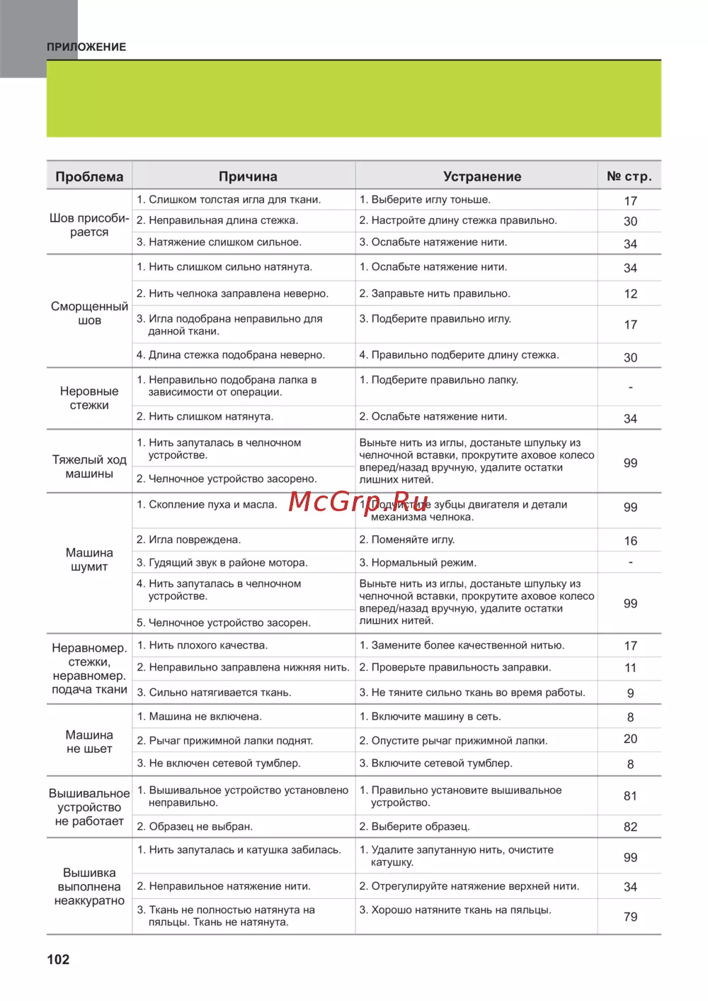 ПРИЛОЖЕНИЕ Проблема Причина 1 Слишком толстая игла для ткани Устранение 1 Выберите иглу тоньше 17 2 Настройте длину стежка правильно 30 3 Натяжение слишком сильное 3 Ослабьте натяжение нити 34 1 Нить слишком сильно натянута 1 Ослабьте натяжение нити 34 2 Нить челнока заправлена неверно 2 Заправьте нить правильно 12 Шов присоби 2 Неправильная длина стежка рается Сморщенный 3 Игла подобрана неправильно для шов 3 Подберите правильно иглу данной ткани Неровные стежки 4 Правильно подберите длину стежка 1 Неправильно подобрана лапка в зависимости от операции 1 Подберите правильно лапку 2 Нить слишком натянута 2 Ослабьте натяжение нити 34 1 Нить запуталась в челночном Выньте нить из иглы достаньте шпульку из челночной вставки прокрутите аховое колесо вперед назад вручную удалите остатки лишних нитей 99 1 Скопление пуха и масла 1 Подчистите зубцы двигателя и детали механизма челнока 99 2 Игла повреждена 2 Поменяйте иглу 16 3 Гудящий звук в районе мотора 3 Нормальный режим 4 Нить запуталась в челночном устройстве Выньте нить из иглы достаньте шпульку из челночной вставки прокрутите аховое колесо вперед назад вручную удалите остатки лишних нитей 5 Челночное устройство засорен 1 Замените более качественной нитью Неравномер 1 Нить плохого качества стежки 2 Неправильно заправлена нижняя нить 2 Проверьте правильность заправки неравномер подача ткани 3 Сильно натягивается ткань 3 Не тяните сильно ткань во время работы Машина не шьет 102 30 99 17 11 9 1 Машина не включена 1 Включите машину в сеть 8 2 Рычаг прижимной лапки поднят 2 Опустите рычаг прижимной лапки 20 3 Не включен сетевой тумблер 3 Включите сетевой тумблер 8 Вышивальное 1 Вышивальное устройство установлено 1 Правильно установите вышивальное неправильно устройство устройство не работает 2 Образец не выбран 2 Выберите образец Вышивка выполнена неаккуратно 17 4 Длина стежка подобрана неверно устройстве Тяжелый ход машины 2 Челночное устройство засорено Машина шумит стр 81 82 1 Нить запуталась и катушка забилась 1 Удалите запутанную нить очистите катушку 99 2 Неправильное натяжение нити 2 Отрегулируйте натяжение верхней нити 34 3 Ткань не полностью натянута на пяльцы Ткань не натянута 3 Хорошо натяните ткань на пяльцы 79