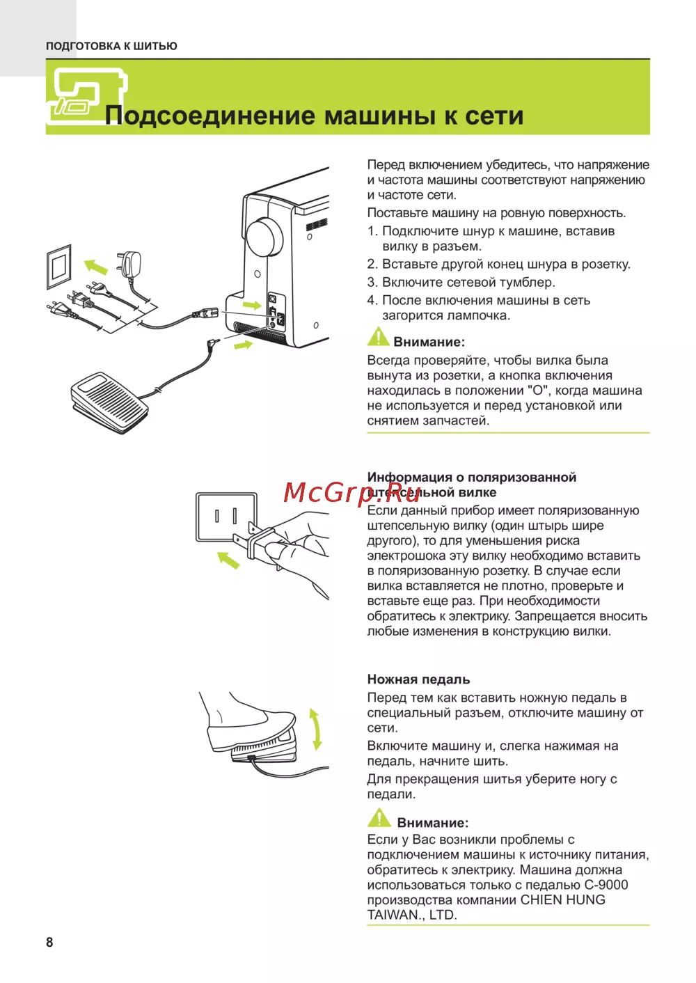 ПОДГОТОВКА К шитью юдсоединение машины к сети Перед включением убедитесь что напряжение и частота машины соответствуют напряжению и частоте сети Поставьте машину на ровную поверхность 1 Подключите шнур к машине вставив вилку в разъем 2 Вставьте другой конец шнура в розетку 3 Включите сетевой тумблер 4 После включения машины в сеть загорится лампочка А Внимание Всегда проверяйте чтобы вилка была вынута из розетки а кнопка включения находилась в положении О когда машина не используется и перед установкой или снятием запчастей Информация о поляризованной штепсельной вилке Если данный прибор имеет поляризованную штепсельную вилку один штырь шире другого то для уменьшения риска электрошока эту вилку необходимо вставить в поляризованную розетку В случае если вилка вставляется не плотно проверьте и вставьте еще раз При необходимости обратитесь к электрику Запрещается вносить любые изменения в конструкцию вилки Ножная педаль Перед тем как вставить ножную педаль в специальный разъем отключите машину от сети Включите машину и слегка нажимая на педаль начните шить Для прекращения шитья уберите ногу с педали Внимание Если у Вас возникли проблемы с подключением машины к источнику питания обратитесь к электрику Машина должна использоваться только с педалью С 9000 производства компании CHIEN HUNG TAIWAN LTD 8