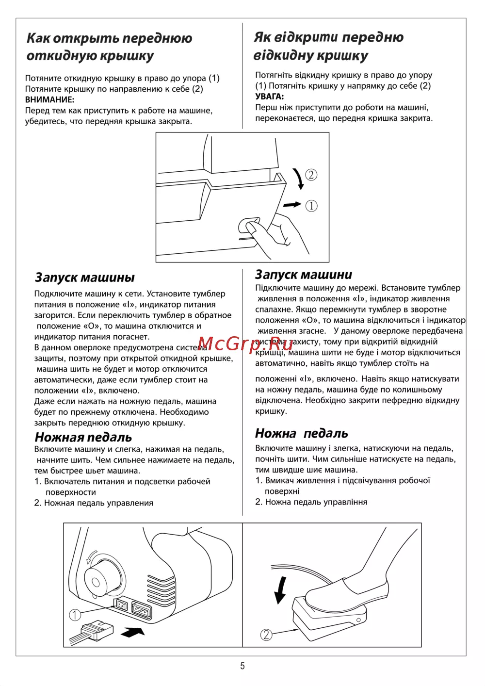 Как открыть переднюю откидную крышку Як в1дкрити передню в дкидну кришку Потяните откидную крышку в право до упора 1 Потяните крышку по направлению к себе 2 Потягн ть вщкидну кришку в право до упору 1 Потягн ть кришку у напрямку до себе 2 УВАГА ВНИМАНИЕ Перш н ж приступити до роботи на машин переконаетеся що передня кришка закрита Перед тем как приступить к работе на машине убедитесь что передняя крышка закрыта Запуск машини Запуск машины Пщключите машину до мереж Встановите тумблер живлення в положения I ндикатор живлення спалахне Якщо перемкнути тумблер в зворотне положения О то машина выключиться ндикатор живлення згасне У даному оверлоке передбачена система захисту тому при в дкрит й в дкидн й кришц машина шити не буде мотор выключиться автоматично нав ть якщо тумблер стопъ на Подключите машину к сети Установите тумблер питания в положение I индикатор питания загорится Если переключить тумблер в обратное положение О то машина отключится и индикатор питания погаснет В данном оверлоке предусмотрена система защиты поэтому при открытой откидной крышке машина шить не будет и мотор отключится автоматически даже если тумблер стоит на положении I включено Даже если нажать на ножную педаль машина будет по прежнему отключена Необходимо закрыть переднюю откидную крышку положенн I включено Нав ть якщо натискувати на ножну педаль машина буде по колишньому в дключена Необх дно закрити пефредню в дкидну кришку Ножная педаль Ножна педаль Включите машину и слегка нажимая на педаль начните шить Чем сильнее нажимаете на педаль тем быстрее шьет машина 1 Включатель питания и подсветки рабочей поверхности 2 Ножная педаль управления Включите машину злегка натискуючи на педаль почн ть шити Чим сильн ше натискуете на педаль тим швидше шие машина 1 Вмикач живлення п дсв чування робочо поверхн 2 Ножна педаль управл ння 5