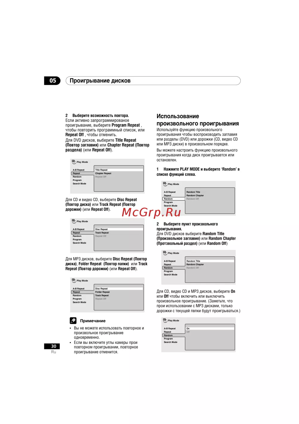 1 Нажмите PLAY MODE и выберите ‘Random’ в