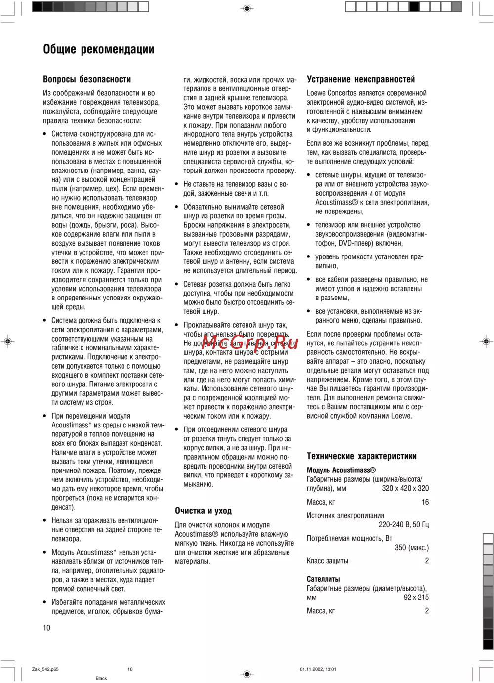 Общие рекомендации Вопросы безопасности Из соображений безопасности и во избежание повреждения телевизора пожалуйста соблюдайте следующие правила техники безопасности Система сконструирована для ис пользования в жилых или офисных помещениях и не может быть ис пользована в местах с повышенной влажностью например ванна сау на или с высокой концентрацией пыли например цех Если времен но нужно использовать телевизор вне помещения необходимо убе диться что он надежно защищен от воды дождь брызги роса Высо кое содержание влаги или пыли в воздухе вызывает появление токов утечки в устройстве что может при вести к поражению электрическим током или к пожару Гарантия про изводителя сохраняется только при условии использования телевизора в определенных условиях окружаю щей среды Система должна быть подключена к сети электропитания с параметрами соответствующими указанным на табличке с номинальными характе ристиками Подключение к электро сети допускается только с помощью входящего в комплект поставки сете вого шнура Питание электросети с другими параметрами может вывес ти систему из строя При перемещении модуля Асоизйтазз из среды с низкой тем пературой в теплое помещение на всех его блоках выпадает конденсат Наличие влаги в устройстве может вызвать токи утечки являющиеся причиной пожара Поэтому прежде чем включить устройство необходи мо дать ему некоторое время чтобы прогреться пока не испарится кон денсат Нельзя загораживать вентиляцион ные отверстия на задней стороне те левизора Модуль Асоизбтазз нельзя уста навливать вблизи от источников теп ла например отопительных радиато ров а также в местах куда падает прямой солнечный свет Избегайте попадания металлических предметов иголок обрывков бума Zak_542 p65 10 ги жидкостей воска или прочих ма териалов в вентиляционные отвер стия в задней крышке телевизора Это может вызвать короткое замы кание внутри телевизора и привести к пожару При попадании любого инородного тела внутрь устройства немедленно отключите его выдер ните шнур из розетки и вызовите специалиста сервисной службы ко торый должен произвести проверку Не ставьте на телевизор вазы с во дой зажженные свечи и т п Обязательно вынимайте сетевой шнур из розетки во время грозы Броски напряжения в электросети вызванные грозовыми разрядами могут вывести телевизор из строя Также необходимо отсоединить се тевой шнур и антенну если система не используется длительный период Сетевая розетка должна быть легко доступна чтобы при необходимости можно было быстро отсоединить се тевой шнур Прокладывайте сетевой шнур так чтобы его нельзя было повредить Не допускайте запутывания сетевого шнура контакта шнура с острыми предметами не размещайте шнур там где на него можно наступить или где на него могут попасть хими каты Использование сетевого шну ра с поврежденной изоляцией мо жет привести к поражению электри ческим током или к пожару При отсоединении сетевого шнура от розетки тянуть следует только за корпус вилки а не за шнур При не правильном обращении можно по вредить проводники внутри сетевой вилки что приведет к короткому за мыканию Устранение неисправностей Loewe Concertos является современной электронной аудио видео системой из готовленной с наивысшим вниманием к качеству удобству использования и функциональн