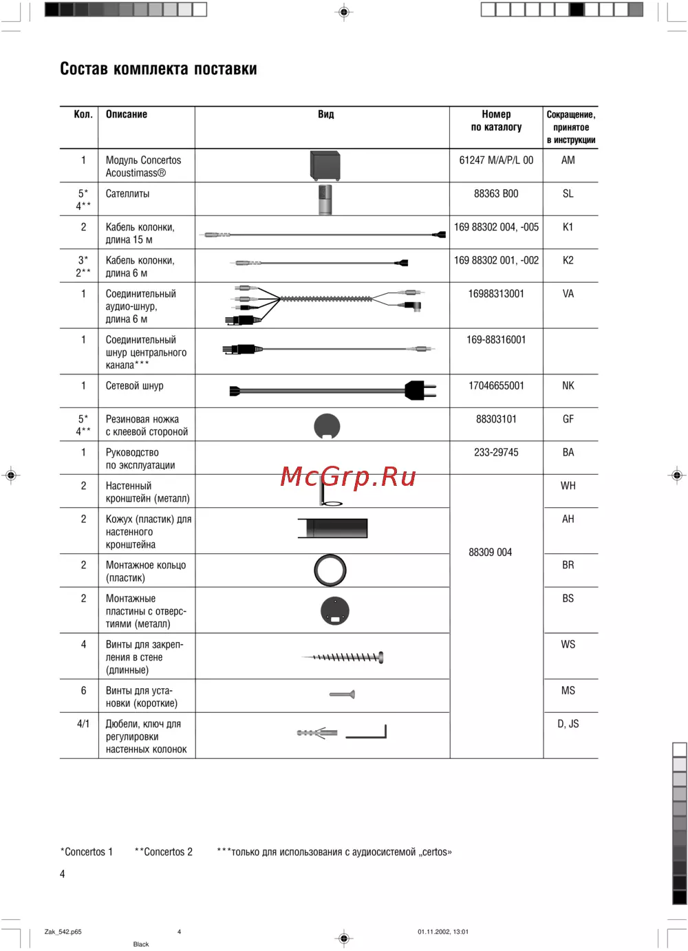 Состав комплекта поставки Кол 1 5 4 Сателлиты Кабель колонки длина 15 м 3 2 Кабель колонки длина 6 м Номер по каталогу ч Модуль Concertos Acoustimass 2 1 Вид Описание лл я Соединительный аудио шнур длина 6 м Сокращение принятое в инструкции 61247 M A P L 00 АМ 88363 В00 SL 169 88302 004 005 К1 169 88302 001 002 К2 16988313001 VA 1 Соединительный шнур центрального канала 169 88316001 1 Сетевой шнур 17046655001 NK 88303101 GF 233 29745 ВА 5 4 Резиновая ножка с клеевой стороной 1 Руководство по эксплуатации 2 Настенный кронштейн металл WH 2 Кожух пластик для настенного кронштейна АН 2 Монтажное кольцо пластик 2 Монтажные пластины с отверс тиями металл 4 о 88309 004 BR BS Винты для закреп WS ления в стене длинные 6 4 1 Винты для уста новки короткие MS Дюбели ключ для регулировки настенных колонок D JS ___ 1 Concertos 1 Concertos 2 только для использования с аудиосистемой certos Zak_542 p65 4 01 11 2002 13 01