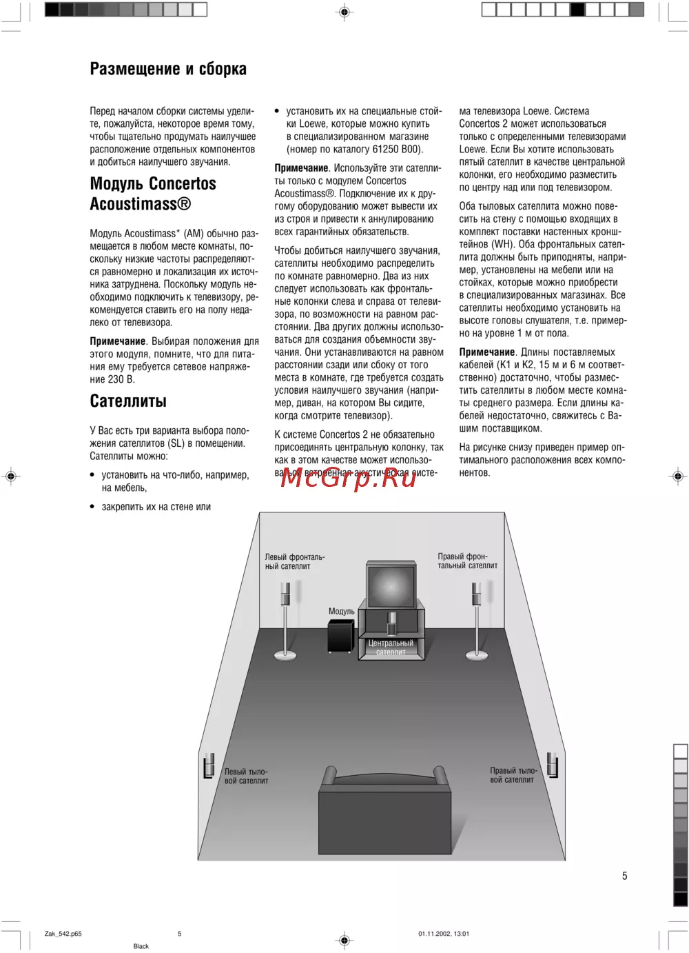 Размещение и сборка Перед началом сборки системы удели те пожалуйста некоторое время тому чтобы тщательно продумать наилучшее расположение отдельных компонентов и добиться наилучшего звучания Модуль Concertos Acoustimass Модуль Acoustimass АМ обычно раз мещается в любом месте комнаты по скольку низкие частоты распределяют ся равномерно и локализация их источ ника затруднена Поскольку модуль не обходимо подключить к телевизору ре комендуется ставить его на полу неда леко от телевизора Примечание Выбирая положения для этого модуля помните что для пита ния ему требуется сетевое напряже ние 230 В Сателлиты У Вас есть три варианта выбора поло жения сателлитов SL в помещении Сателлиты можно установить на что либо например на мебель установить их на специальные стой ки Loewe которые можно купить в специализированном магазине номер по каталогу 61250 В00 Примечание Используйте эти сателли ты только с модулем Concertos Acoustimass Подключение их к дру гому оборудованию может вывести их из строя и привести к аннулированию всех гарантийных обязательств Чтобы добиться наилучшего звучания сателлиты необходимо распределить по комнате равномерно Два из них следует использовать как фронталь ные колонки слева и справа от телеви зора по возможности на равном рас стоянии Два других должны использо ваться для создания объемности зву чания Они устанавливаются на равном расстоянии сзади или сбоку оттого места в комнате где требуется создать условия наилучшего звучания напри мер диван на котором Вы сидите когда смотрите телевизор К системе Concertos 2 не обязательно присоединять центральную колонку так как в этом качестве может использо ваться встроенная акустическая систе ма телевизора Loewe Система Concertos 2 может использоваться только с определенными телевизорами Loewe Если Вы хотите использовать пятый сателлит в качестве центральной колонки его необходимо разместить по центру над или под телевизором Оба тыловых сателлита можно пове сить на стену с помощью входящих в комплект поставки настенных кронш тейнов WH Оба фронтальных сател лита должны быть приподняты напри мер установлены на мебели или на стойках которые можно приобрести в специализированных магазинах Все сателлиты необходимо установить на высоте головы слушателя т е пример но на уровне 1 м от пола Примечание Длины поставляемых кабелей К1 и К2 15 м и 6 м соответ ственно достаточно чтобы размес тить сателлиты в любом месте комна ты среднего размера Если длины ка белей недостаточно свяжитесь с Ва шим поставщиком На рисунке снизу приведен пример оп тимального расположения всех компо нентов закрепить их на стене или 5 Zak_542 p65 5 01 11 2002 13 01