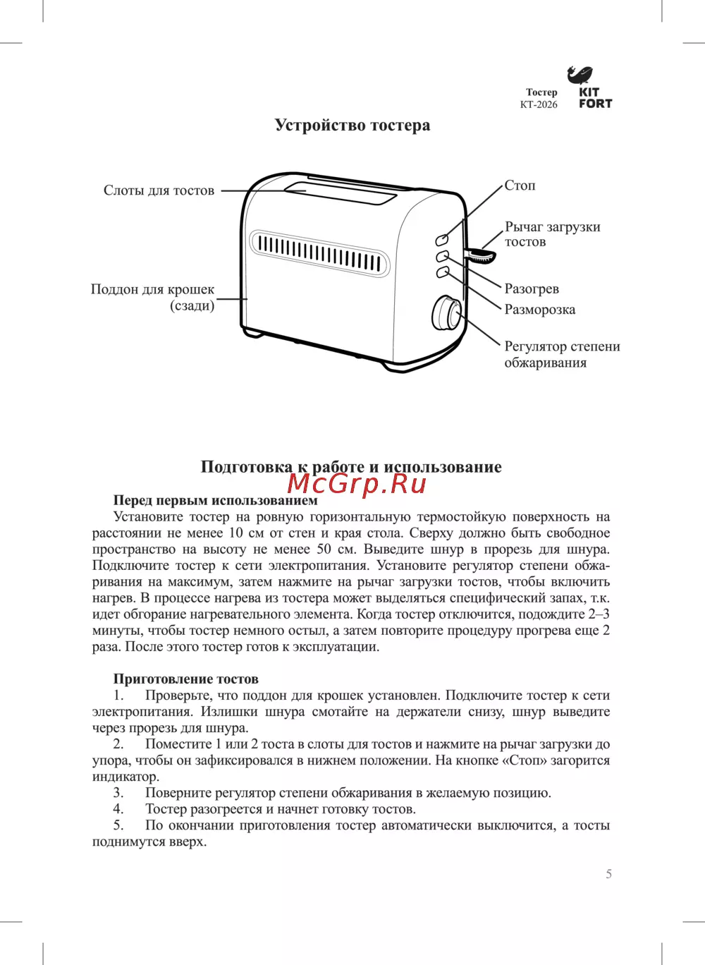 Тостер KIT КТ 2026 FORT Устройство тостера Подготовка к работе и использование Перед первым использованием Установите тостер на ровную горизонтальную термостойкую поверхность на расстоянии не менее 10 см от стен и края стола Сверху должно быть свободное пространство на высоту не менее 50 см Выведите шнур в прорезь для шнура Подключите тостер к сети электропитания Установите регулятор степени обжа ривания на максимум затем нажмите на рычаг загрузки тостов чтобы включить нагрев В процессе нагрева из тостера может выделяться специфический запах т к идет обгорание нагревательного элемента Когда тостер отключится подождите 2 3 минуты чтобы тостер немного остыл а затем повторите процедуру прогрева еще 2 раза После этого тостер готов к эксплуатации Приготовление тостов 1 Проверьте что поддон для крошек установлен Подключите тостер к сети электропитания Излишки шнура смотайте на держатели снизу шнур выведите через прорезь для шнура 2 Поместите 1 или 2 тоста в слоты для тостов и нажмите на рычаг загрузки до упора чтобы он зафиксировался в нижнем положении На кнопке Стоп загорится индикатор 3 Поверните регулятор степени обжаривания в желаемую позицию 4 Тостер разогреется и начнет готовку тостов 5 По окончании приготовления тостер автоматически выключится а тосты поднимутся вверх 5