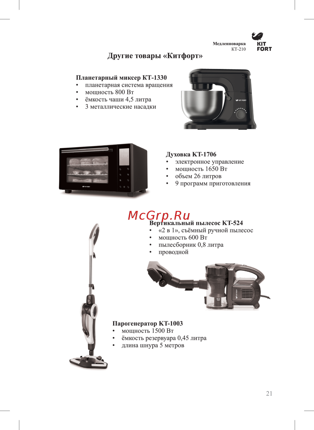 Медленноварка KIT КТ 210 FORT Другие товары Китфорт Планетарный миксер КТ 1330 планетарная система вращения мощность 800 Вт ёмкость чаши 4 5 литра 3 металлические насадки Духовка КТ 1706 электронное управление мощность 1650 Вт объем 26 литров 9 программ приготовления Вертикальный пылесос КТ 524 2 в 1 съёмный ручной пылесос мощность 600 Вт пылесборник 0 8 литра проводной Парогенератор КТ 1003 мощность 1500 Вт ёмкость резервуара 0 45 литра длина шнура 5 метров 21