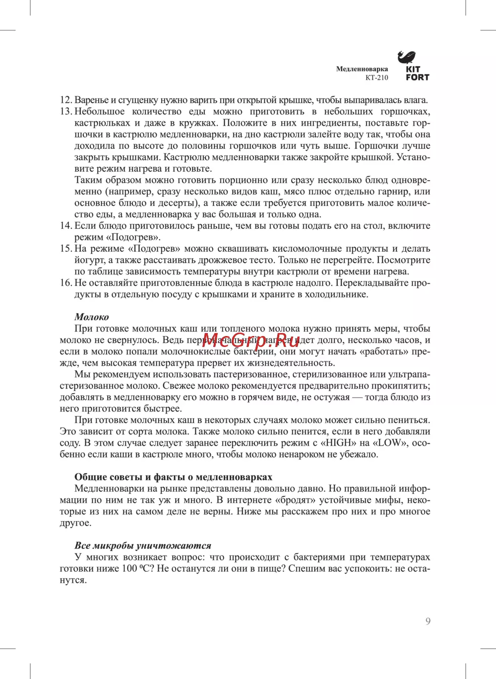 Медленноварка KIT KT 210 FORT 12 Варенье и сгущенку нужно варить при открытой крышке чтобы выпаривалась влага 13 Небольшое количество еды можно приготовить в небольших горшочках кастрюльках и даже в кружках Положите в них ингредиенты поставьте гор шочки в кастрюлю медленноварки на дно кастрюли залейте воду так чтобы она доходила по высоте до половины горшочков или чуть выше Горшочки лучше закрыть крышками Кастрюлю медленноварки также закройте крышкой Устано вите режим нагрева и готовьте Таким образом можно готовить порционно или сразу несколько блюд одновре менно например сразу несколько видов каш мясо плюс отдельно гарнир или основное блюдо и десерты а также если требуется приготовить малое количе ство еды а медленноварка у вас большая и только одна 14 Если блюдо приготовилось раньше чем вы готовы подать его на стол включите режим Подогрев 15 На режиме Подогрев можно сквашивать кисломолочные продукты и делать йогурт а также расстаивать дрожжевое тесто Только не перегрейте Посмотрите по таблице зависимость температуры внутри кастрюли от времени нагрева 16 Не оставляйте приготовленные блюда в кастрюле надолго Перекладывайте про дукты в отдельную посуду с крышками и храните в холодильнике Молоко При готовке молочных каш или топленого молока нужно принять меры чтобы молоко не свернулось Ведь первоначальный нагрев идет долго несколько часов и если в молоко попали молочнокислые бактерии они могут начать работать пре жде чем высокая температура прервет их жизнедеятельность Мы рекомендуем использовать пастеризованное стерилизованное или ультрапастеризованное молоко Свежее молоко рекомендуется предварительно прокипятить добавлять в медленноварку его можно в горячем виде не остужая тогда блюдо из него приготовится быстрее При готовке молочных каш в некоторых случаях молоко может сильно пениться Это зависит от сорта молока Также молоко сильно пенится если в него добавляли соду В этом случае следует заранее переключить режим с HIGH на LOW осо бенно если каши в кастрюле много чтобы молоко ненароком не убежало Общие советы и факты о медленноварках Медленноварки на рынке представлены довольно давно Но правильной инфор мации по ним не так уж и много В интернете бродят устойчивые мифы неко торые из них на самом деле не верны Ниже мы расскажем про них и про многое другое Все микробы уничтожаются У многих возникает вопрос что происходит с бактериями при температурах готовки ниже 100 C Не останутся ли они в пище Спешим вас успокоить не оста нутся 9