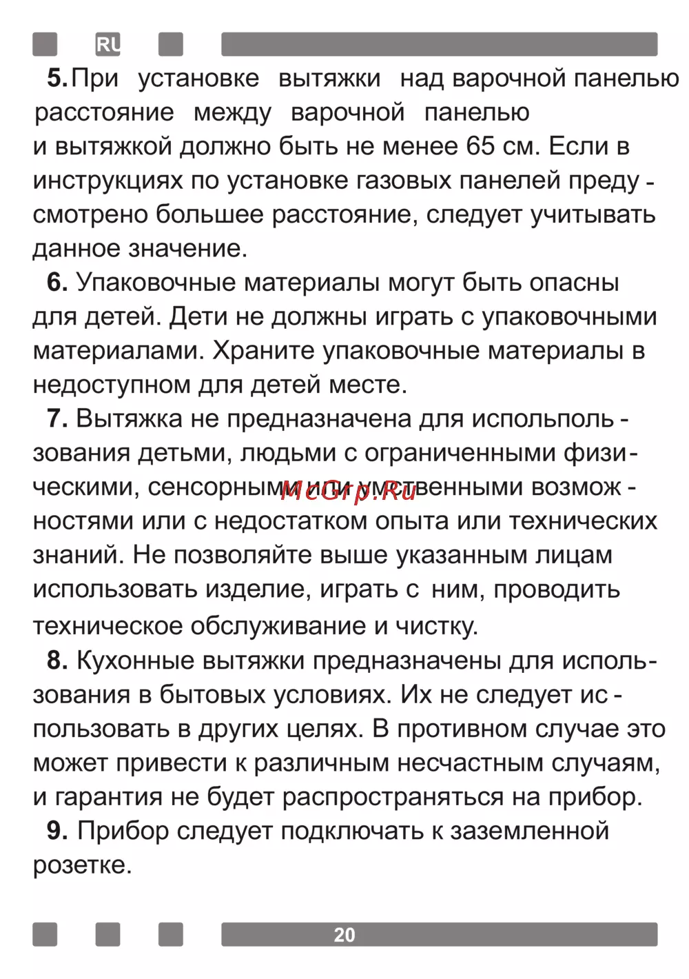 Обязательное соблюдение расстояния при установке вытяжки над варочной панелью, безопасность использования, предупреждения для детей и людей с ограниченными возможностями, условия эксплуатации и важность заземления розетки.