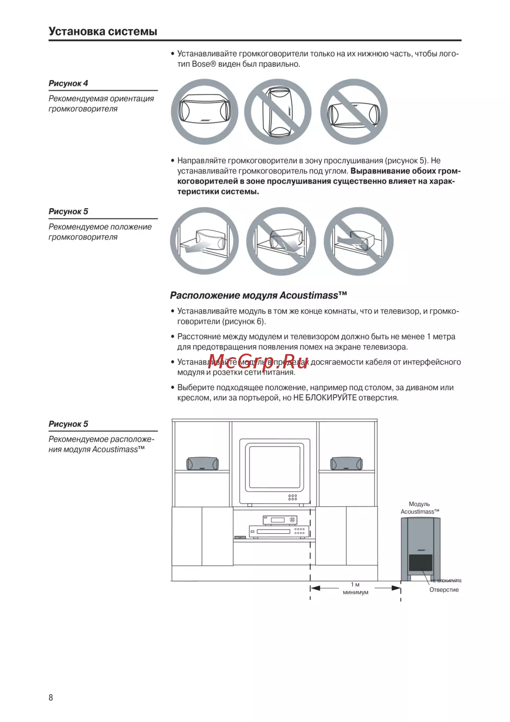 Установка системы Устанавливайте громкоговорители только на их нижнюю часть чтобы лого тип Bose виден был правильно Рисунок 4 Рекомендуемая ориентация громкоговорителя Направляйте громкоговорители в зону прослушивания рисунок 5 Не устанавливайте громкоговоритель под углом Выравнивание обоих гром коговорителей в зоне прослушивания существенно влияет на харак теристики системы Рисунок 5 Рекомендуемое положение громкоговорителя Расположение модуля АсоизИтазз Устанавливайте модуль в том же конце комнаты что и телевизор и громко говорители рисунок 6 Расстояние между модулем и телевизором должно быть не менее 1 метра для предотвращения появления помех на экране телевизора Устанавливайте модуль в пределах досягаемости кабеля от интерфейсного модуля и розетки сети питания Выберите подходящее положение например под столом за диваном или креслом или за портьерой но НЕ БЛОКИРУЙТЕ отверстия Рисунок 5 Рекомендуемое расположе ния модуля Acoustimass 8