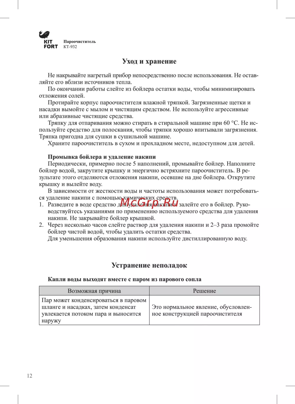 й KIT Пароочиститель FORT КТ 932 Уход и хранение Не накрывайте нагретый прибор непосредственно после использования Не остав ляйте его вблизи источников тепла По окончании работы слейте из бойлера остатки воды чтобы минимизировать отложения солей Протирайте корпус пароочистителя влажной тряпкой Загрязненные щетки и насадки вымойте с мылом и чистящим средством Не используйте агрессивные или абразивные чистящие средства Тряпку для отпаривания можно стирать в стиральной машине при 60 C Не ис пользуйте средство для полоскания чтобы тряпки хорошо впитывали загрязнения Тряпка пригодна для сушки в сушильной машине Храните пароочиститель в сухом и прохладном месте недоступном для детей Промывка бойлера и удаление накипи Периодически примерно после 5 наполнений промывайте бойлер Наполните бойлер водой закрутите крышку и энергично встряхните пароочиститель В ре зультате этого отделяются отложения накипи осевшие на дне бойлера Открутите крышку и вылейте воду В зависимости от жесткости воды и частоты использования может потребовать ся удаление накипи с помощью химических средств 1 Разведите в воде средство для удаления накипи и залейте его в бойлер Руко водствуйтесь указаниями по применению используемого средства для удаления накипи Не закрывайте бойлер крышкой 2 Через несколько часов слейте раствор для удаления накипи и 2 3 раза промойте бойлер чистой водой чтобы удалить остатки средства Для уменьшения образования накипи используйте дистиллированную воду Устранение неполадок Капли воды выходят вместе с паром из парового сопла Возможная причина Пар может конденсироваться в паровом шланге и насадках затем конденсат увлекается потоком пара и выносится наружу 12 Решение Это нормальное явление обусловлен ное конструкцией пароочистителя
